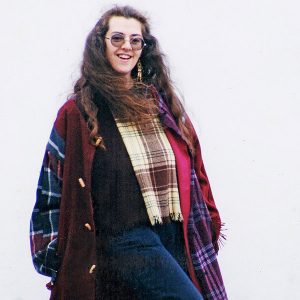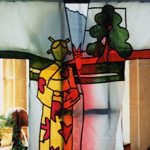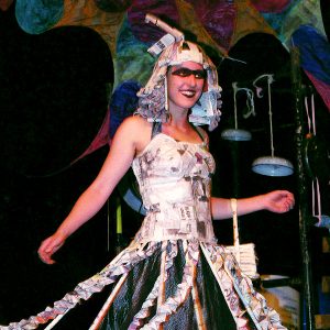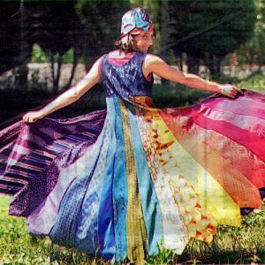 An over-dress made from many coloured ties to create a rainbow (1996).