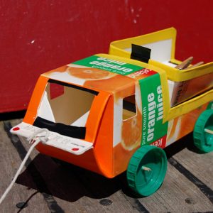 Simple idea to use household materials to create a truck with wheels that turn – lots of possible variants.