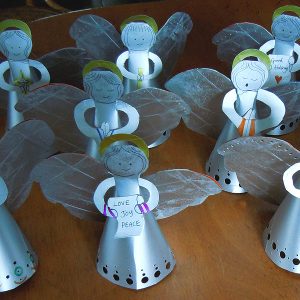 Hosts of angels made from milk cartons.