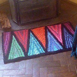 A hooked rag rug made by finishing the edges first – so no need for a frame. Updated to include a repair.