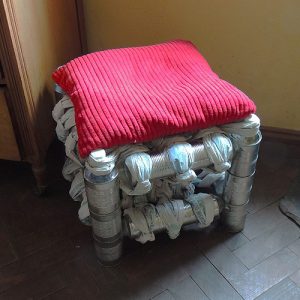 An experimental bonding of tin cans using PET bottles to make a structure. Finished off with some carrier bag windmill loop weaving.
