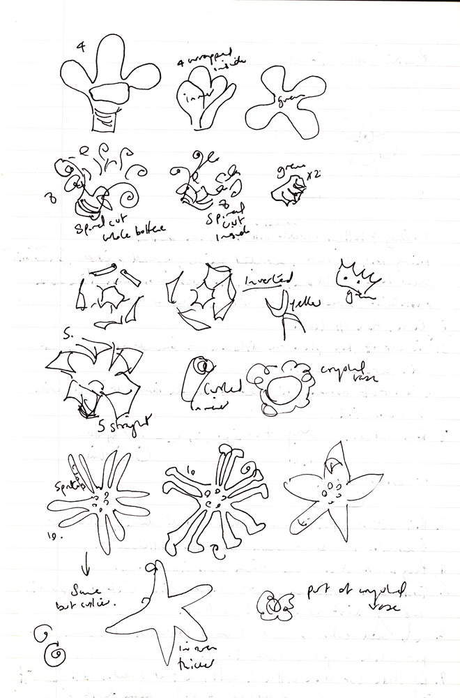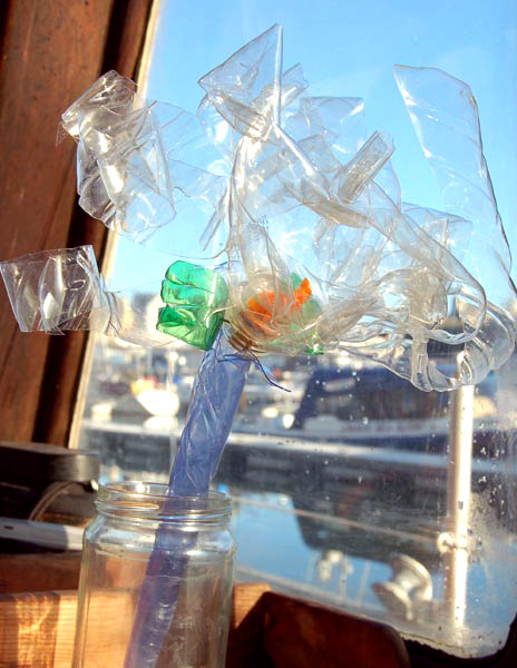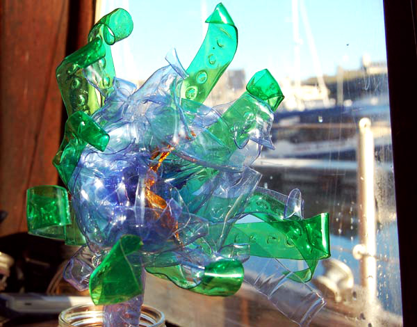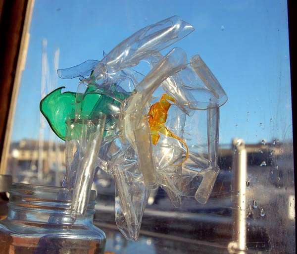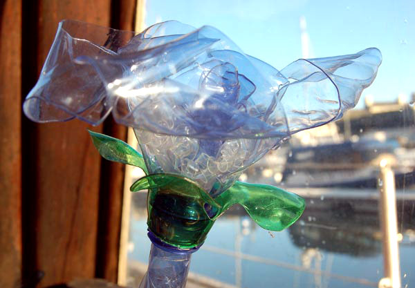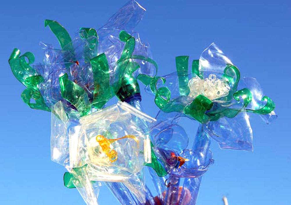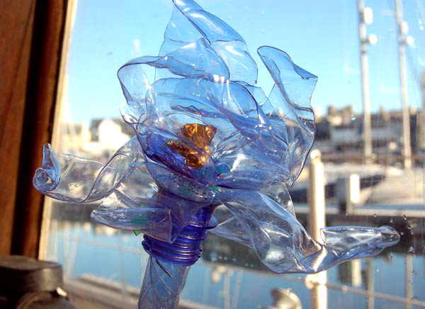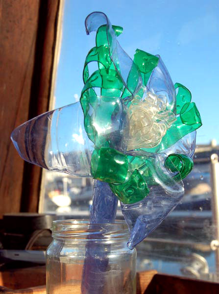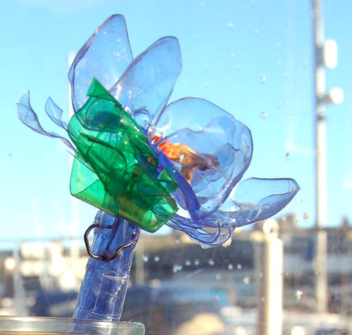 I tried out a number of petal configurations and shapes using white and green bottles and light blue water bottles. The petals are finished and curled using almost boiling water, colour in the centre uses cellophane sweet wrappers.