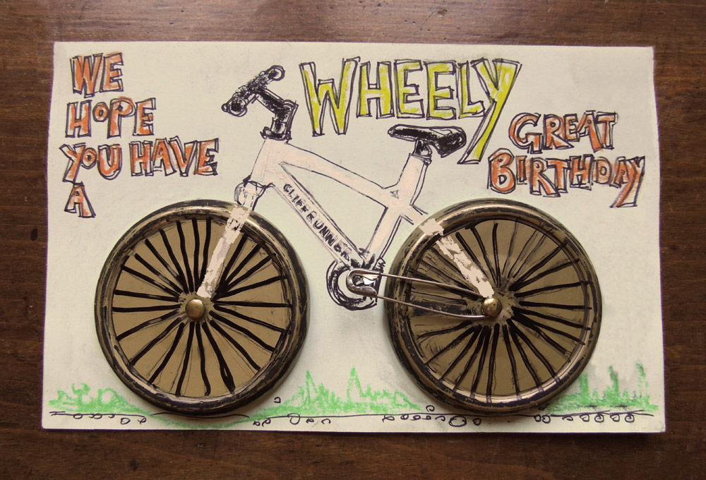 A fun and silly card to celebrate getting a very special present. Just a couple of jar lids and split pins and a big safety pin.