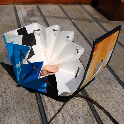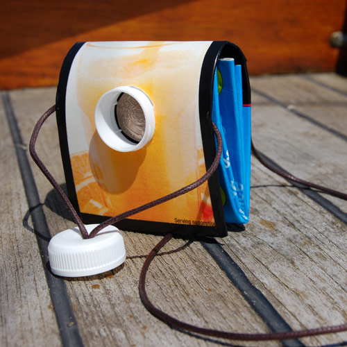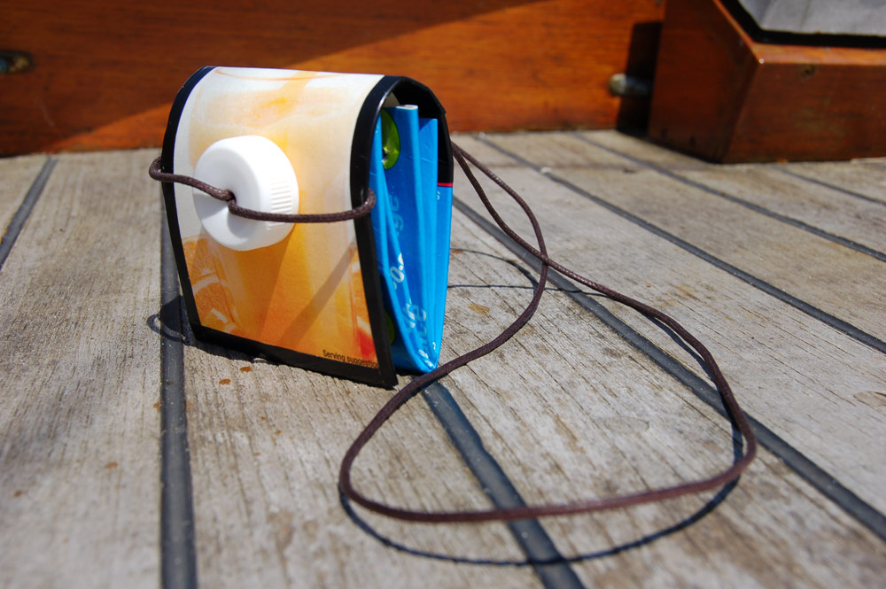 I punched holes for a string strap that prevents the lid from being lost and so you can wear your wallet around your neck or shoulder.