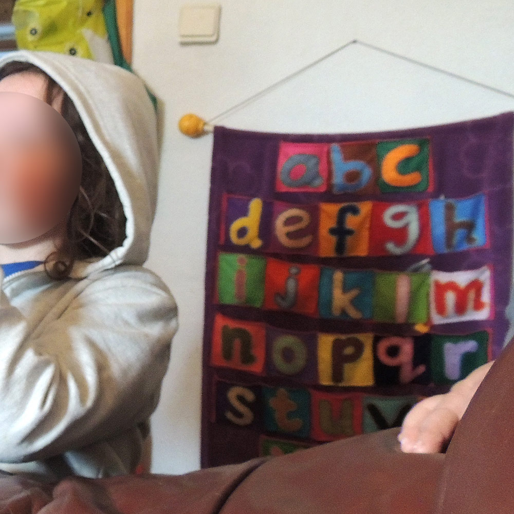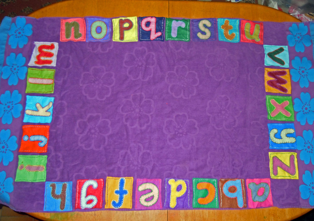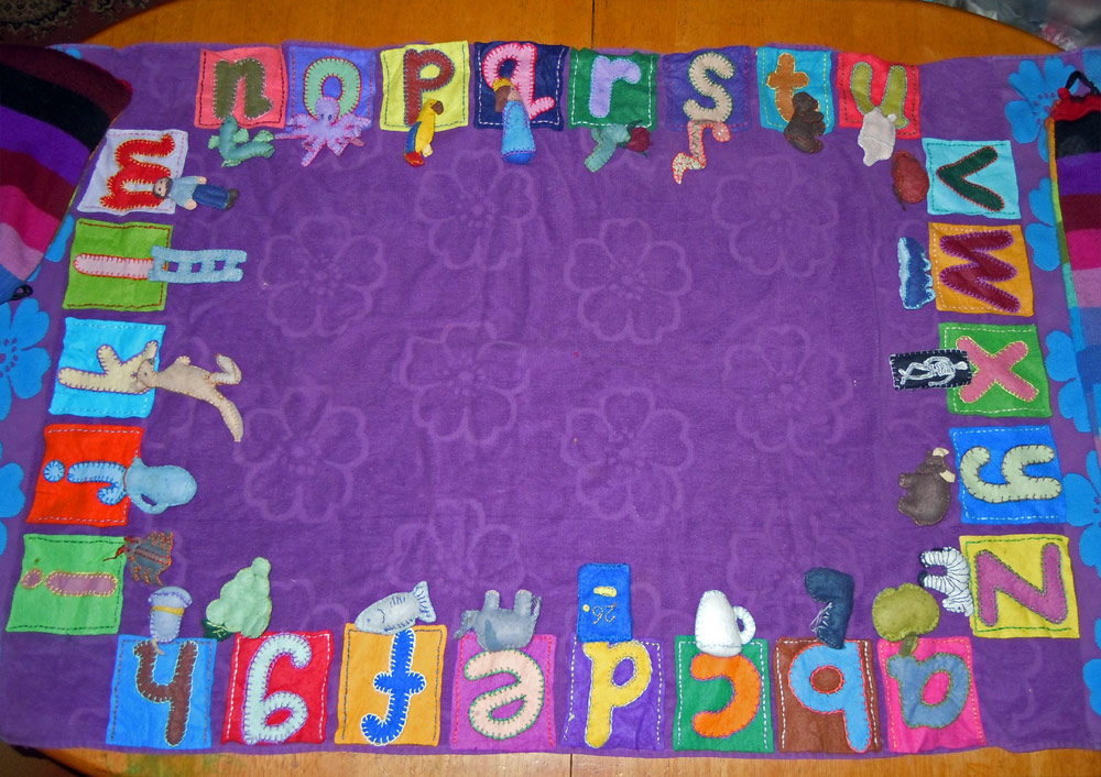 I made this alphabet mat a few years ago with my daughter. The base is an old beach towel and we sewed felt pockets containing felt objects corresponding with each letter. We used up lots of embroidery thread we had got from a local scrapstore. This original version rolled up into a bag so that it could be stored away. I made from my daughters scarf which she said she’d no longer wear – and I just can’t resist rainbows.
