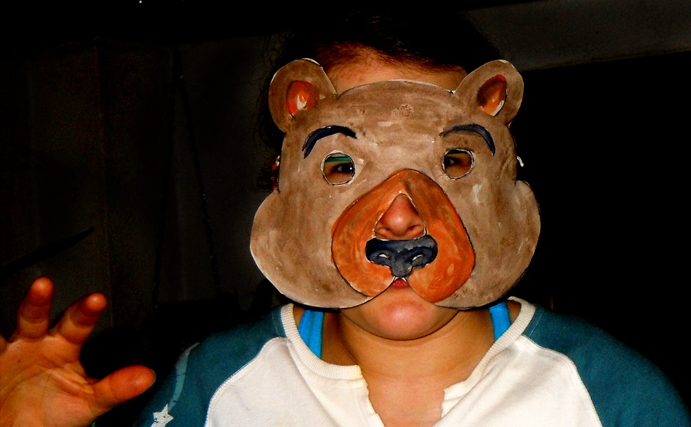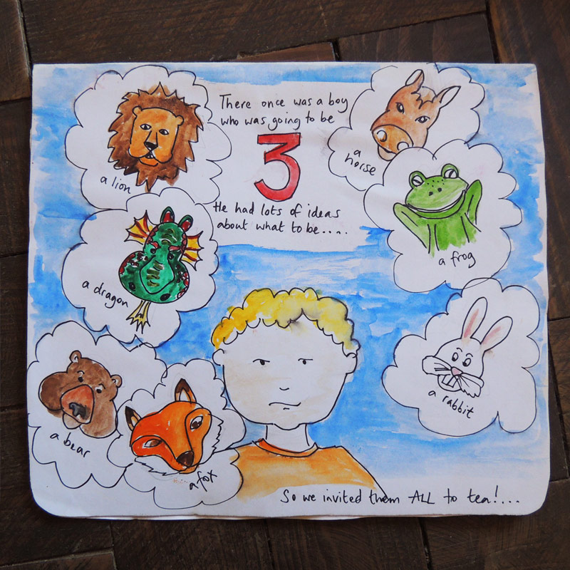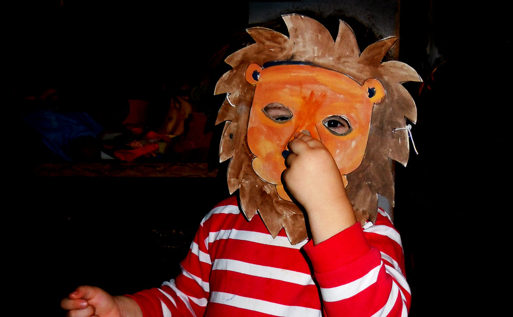 Masks for a three year olds’ birthday party. When asked what his favourite animal was, my son replied Lion, Rabbit, Frog, Dragon, Bear, Horse, Fox – so that was the theme of the party – we gave them a birthday tea.