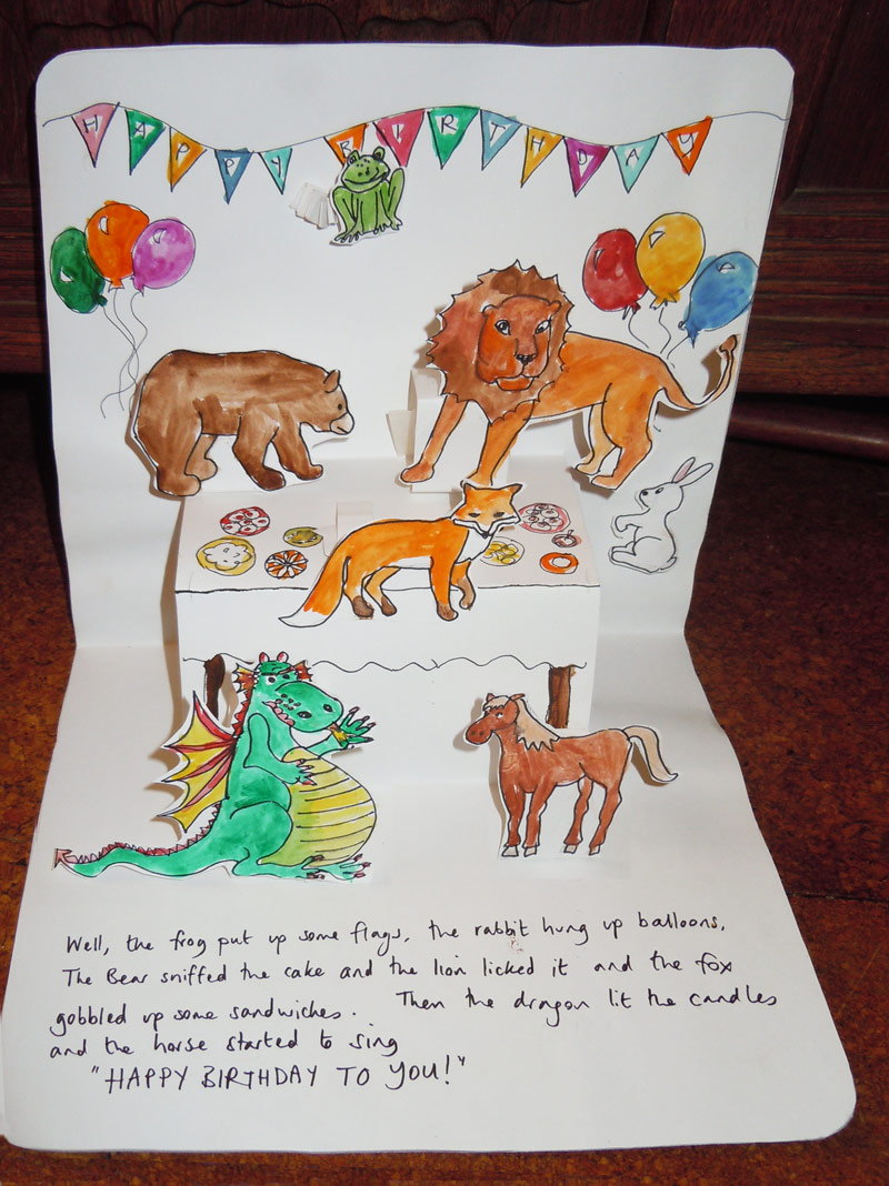 Many of my cards are made the night before they’re needed which explains their ‘thrown together’ qualities. I really like making them (there’s nothing like a deadline to give you focus). Many are made from frozen pizza boxes (we tend to have a lot of them), the card is similar to cereal boxes but comes in squares. I often use wood glue (PVA) to glue them together and I like to look for ways to make them 3D and interactive. These large ones are for immediate family so we don’t need to post them. We store them in boot boxes (bigger than shoe boxes) and they’re lovely things to rifle through when you’re feeling sentimental. The biggest impact my card making has had is to inspire my kids to make creative cards themselves – we’ve now quite a collection!