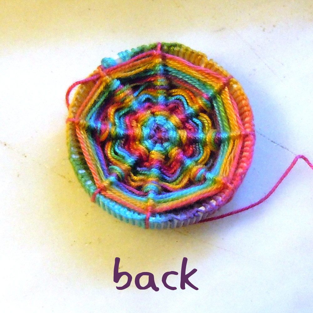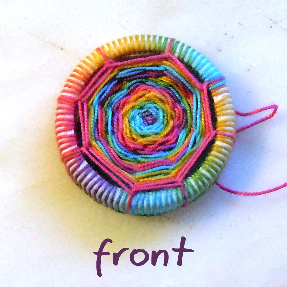 These buttons are made using a ‘Dorset’ button technique that I found similar to Ojos de Dios or ‘God’s eyes’. First I cut away the top of the cap to make a ring and then bound it with thread – which was very satisfying because the grooves are already there.