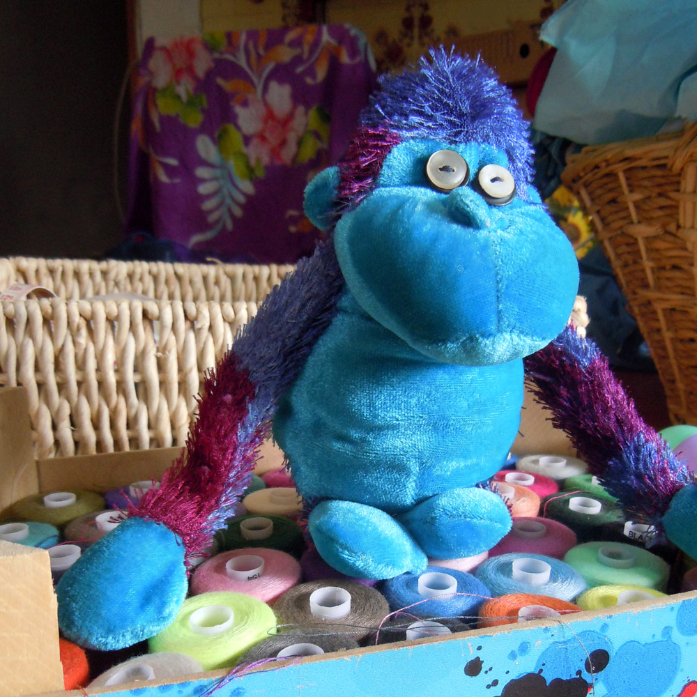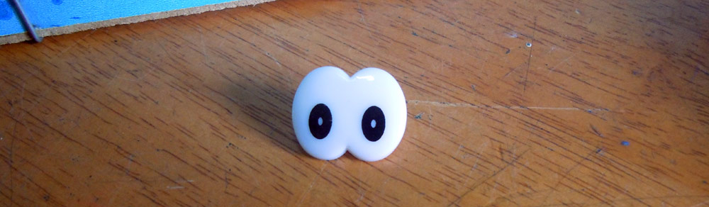 I happen to think that button eyes are great. When the eyes fell off this – is it a gorilla? – I thought it was a good thing – now we could give it good button eyes – I think it has a lot more character than before, and we can add the weird plastic eyes to our collection of things to make things out of.