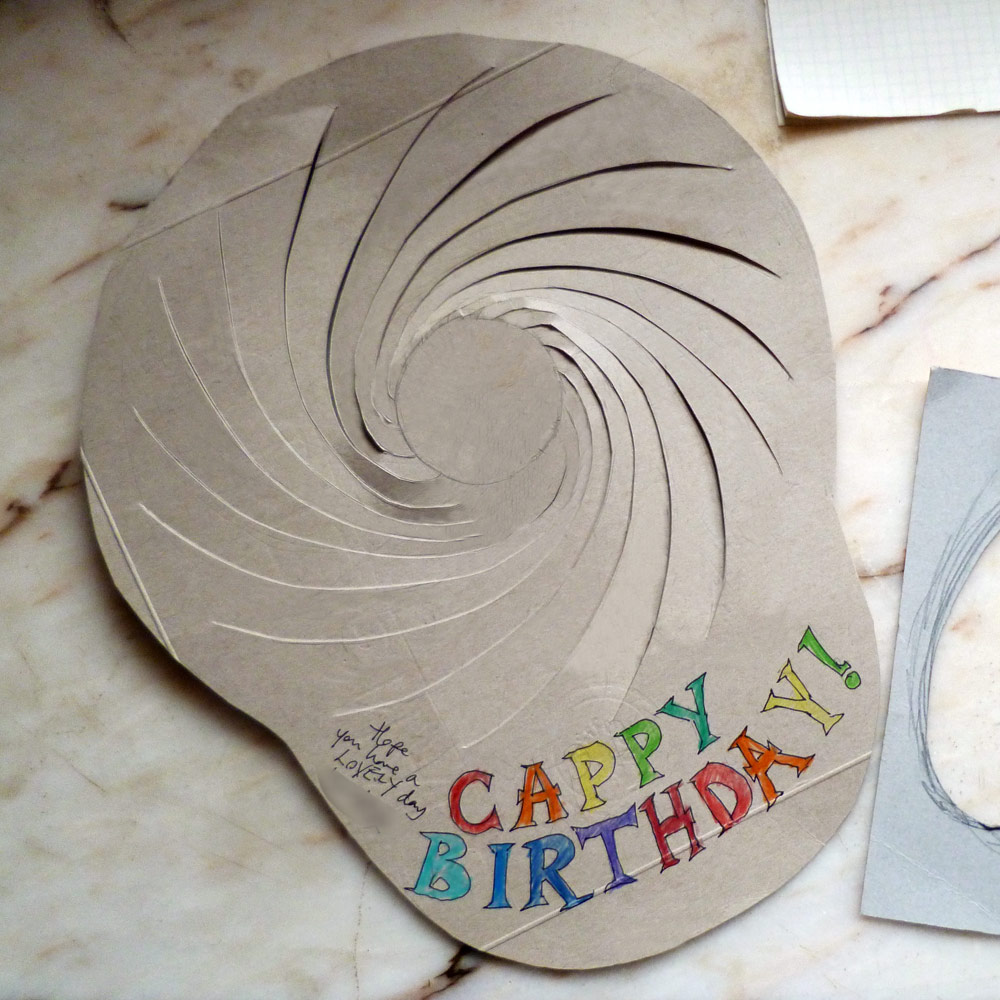 This card is for someone who LOVES caps. I had seen these card hats as a child and I think they’re still popular as a promotional tool at events. I thought I’d have a go at trying to work out how to achieve the spiral cuts.