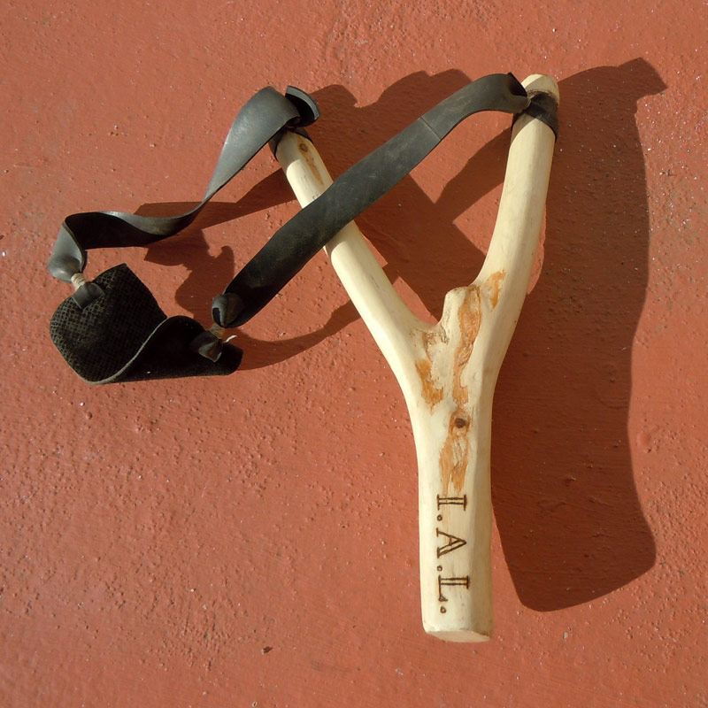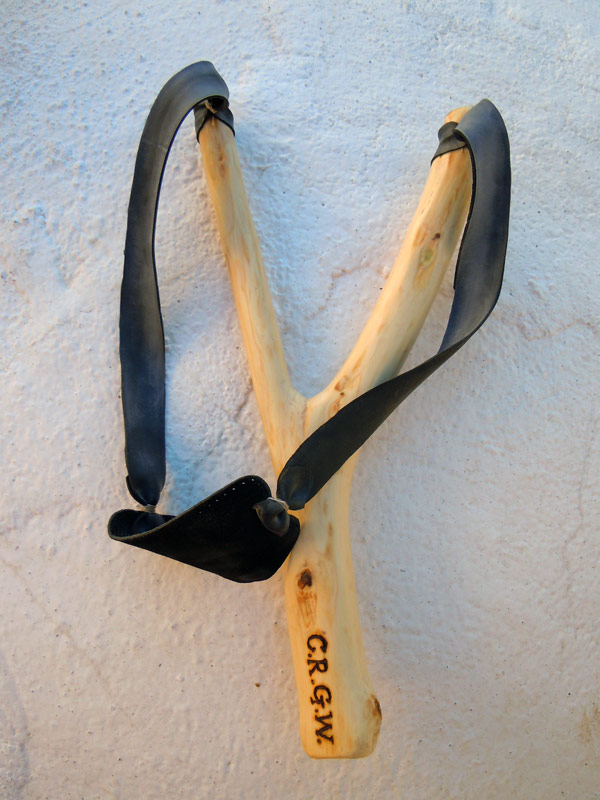 We’ve made a whole set of catapults as gifts. They are made from olive prunings, bicycle inner rube and leather from old boots. We personalised them with pyroed initials because there are different sizes for different sized hands. They work really well!