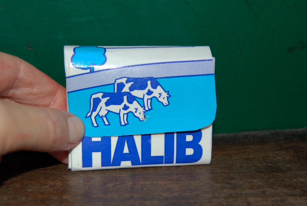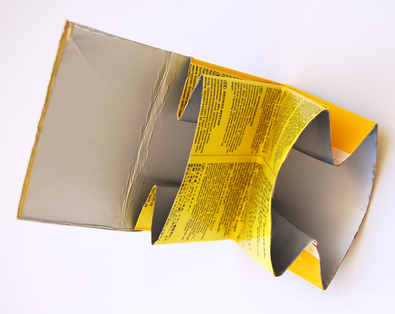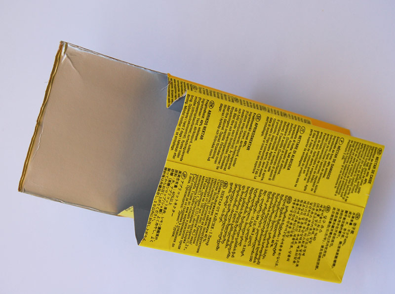 It’s possibly the most simple thing you can make with a carton. Just trim, wash and dry. Then cut off a section a third from the top – leaving a piece for the lid. Then crease the side panels in and fold that creased section in half. You can staple the middle section or just leave it. Fasten with velcro or a rubber band – whatever you have at hand.