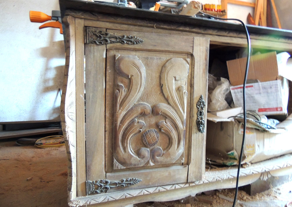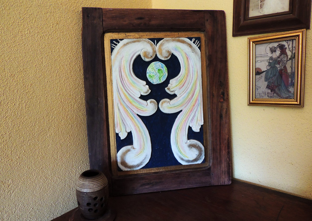 We inherited an old cupboard that was literally falling apart and the door had already come off. Upside down I could see the shapes of angels so I cleaned and sanded it lightly and added whatever I had at hand – some white emulsion, a little bit of acrylic, watercolour, some gold paint called ‘Gold Finger’ which I also inherited and was keen to try out. The frame is finished with shoe polish and could probably do with another coat and some oil or wax I think.