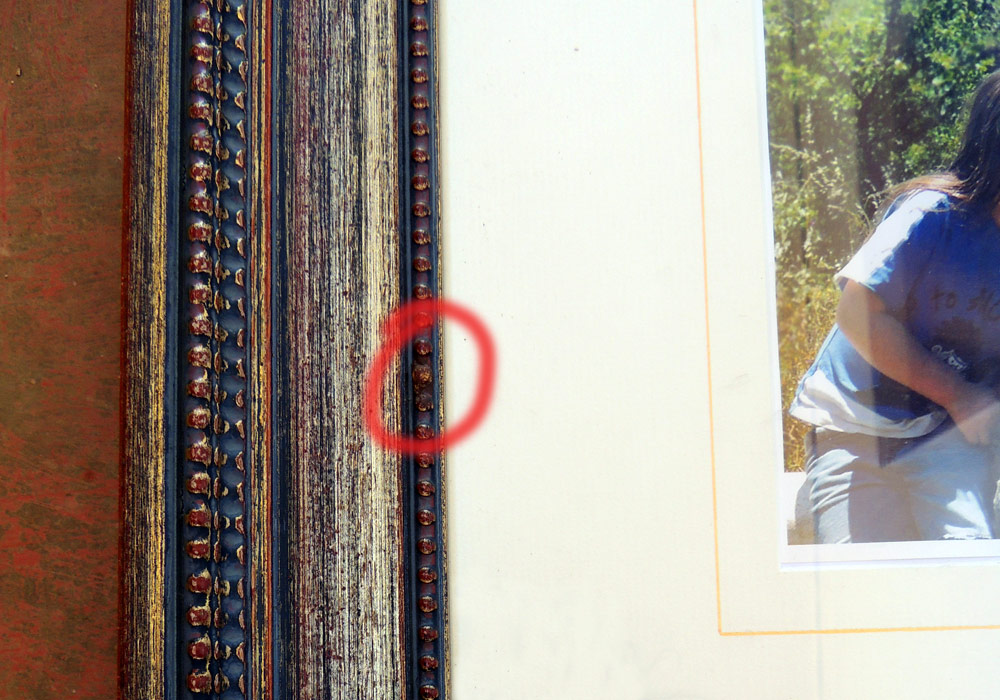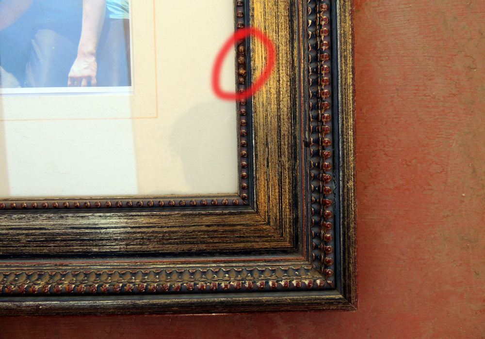 There were a couple of chips missing from the frame and the bare wood looked unsightly. For the larger section I whittled down a bit of old wooden peg until it fitted and wood glued it in. Then I hunted around for something to act as beading and finally settled for lentils. I wood glued these in place and gave them a couple of coats of acrylic to try and blend in the colour.