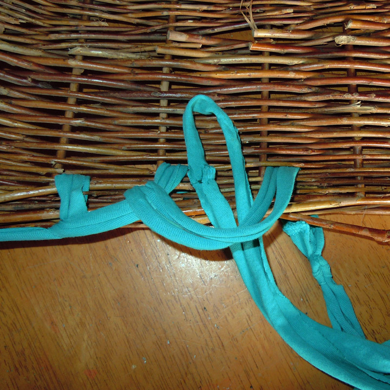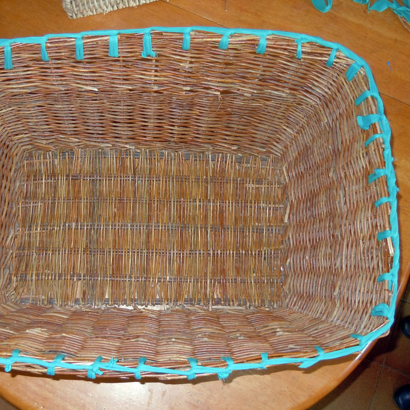Some leftover t-shirt yarn from the chair seat fix is used to fix this old basket. I used a blanket stitch – it wasn’t complicated – and I’ve made something that might have ended up in the compost heap into a book basket that I think looks better than before.