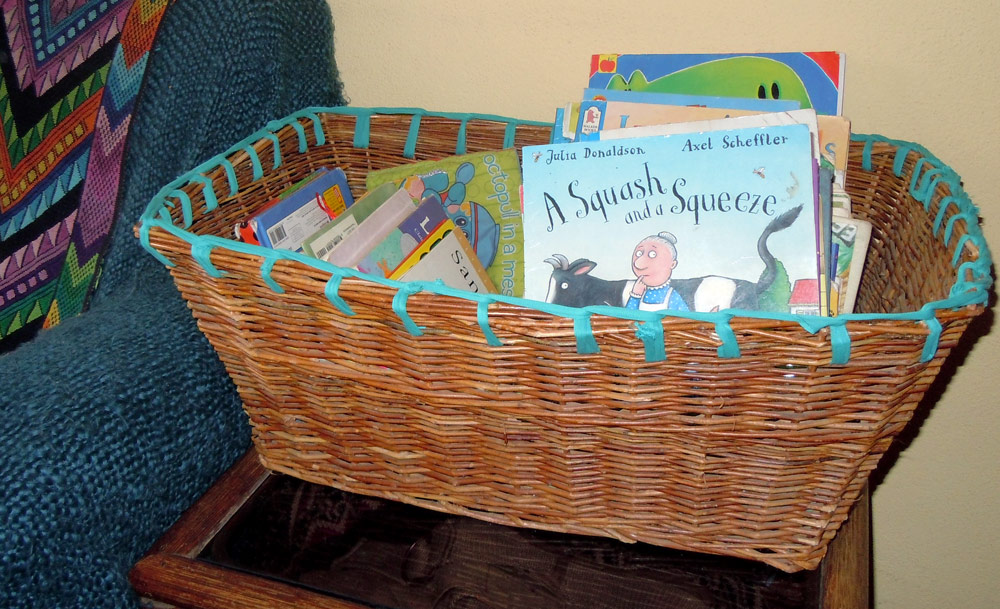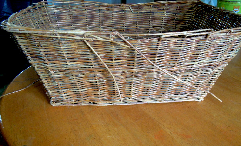 Some leftover t-shirt yarn from the chair seat fix is used to fix this old basket. I used a blanket stitch – it wasn’t complicated – and I’ve made something that might have ended up in the compost heap into a book basket that I think looks better than before.