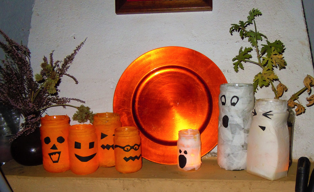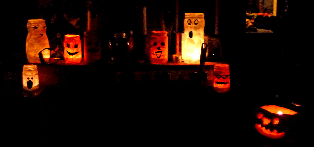 These are so simple to make and they’re really effective. They just use tissue paper and watered down PVA and black paper for the faces. They go with the pumpkin to make a lovely glowy display.