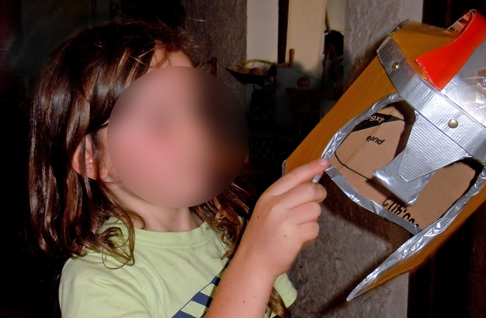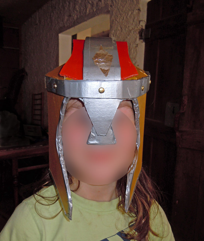 A quick cardboard helmet with acrylic paint, silver gaffa tape and some split pins. We had a knight themed birthday and this is just what was needed.