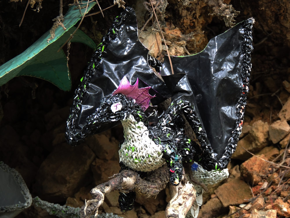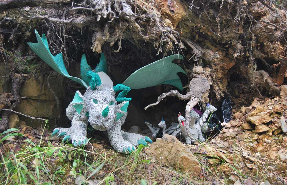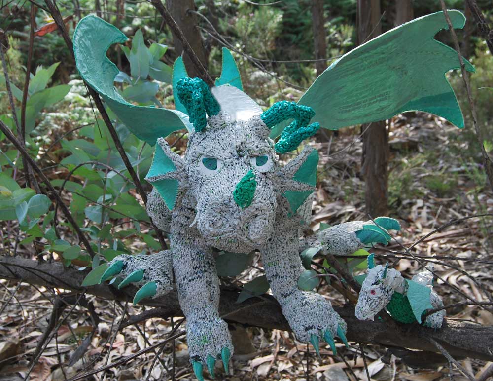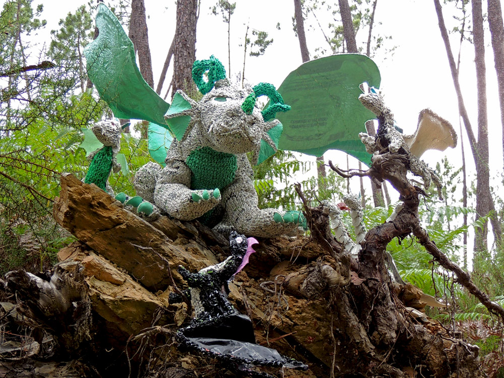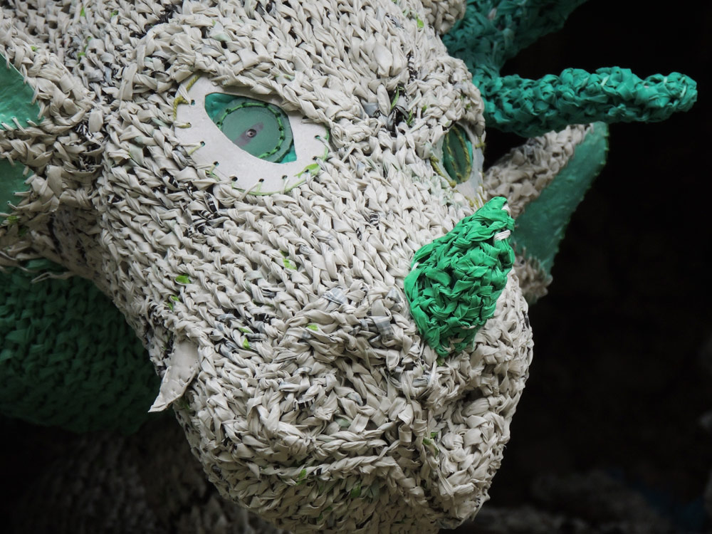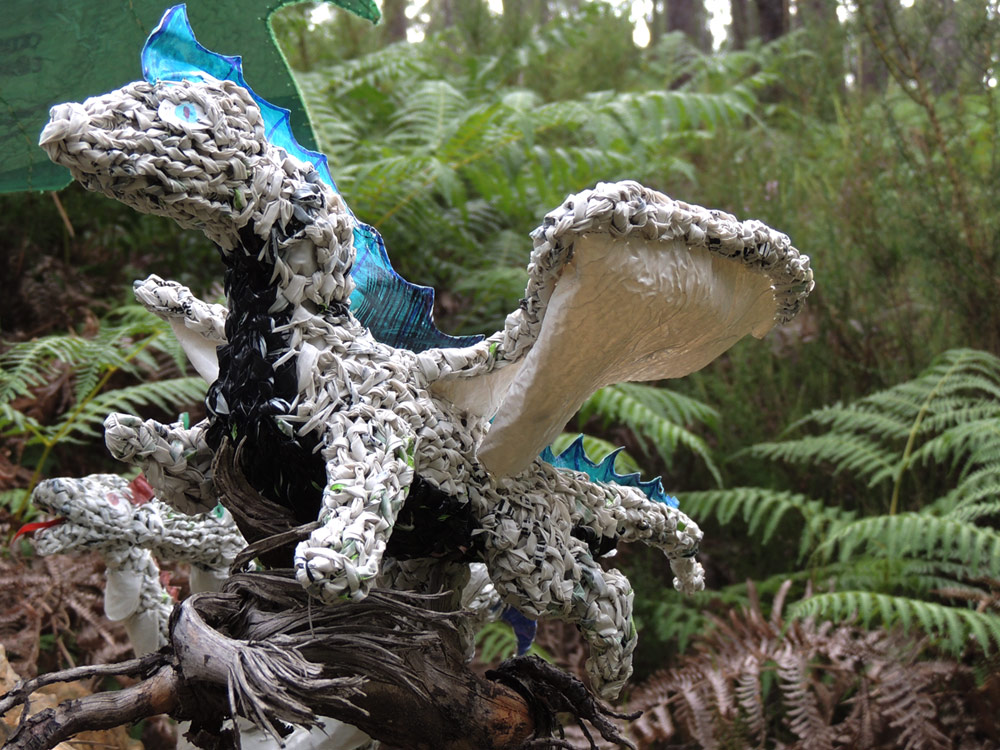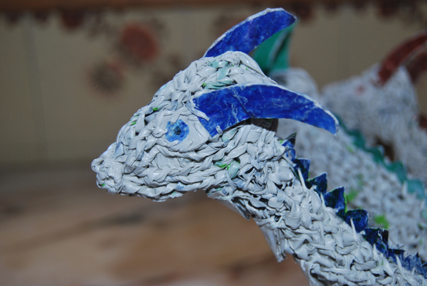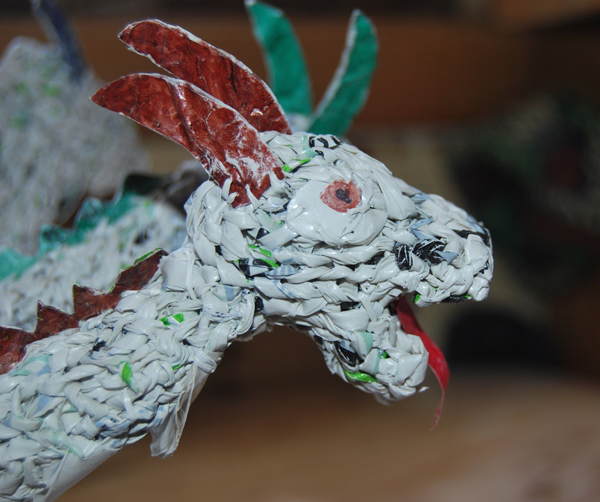 I had knitted quite a few dragons before this and I wanted to make a really big one but I knew I didn’t have enough material for the size I wanted. I thought about what I did have and I came to the realisation that I had stacks of plastic bags. One might say it was slightly ambitious to try to knit a dragon roughly 35cm high, 65cm long (with tail bent) and a 70cm wingspan out of strips of plastic bag when your only prior experience knitting with the material was a 10cm square to see if it was even possible. I have now made several such dragons and have learnt a lot from the experience.