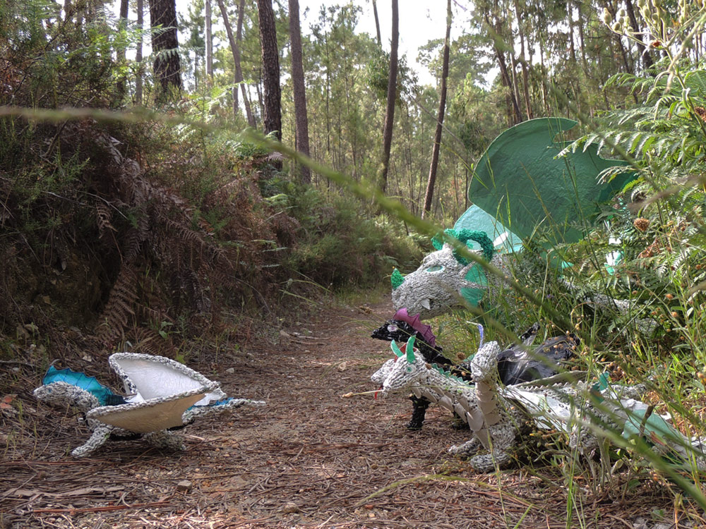 The wings are made from plastic bags I ironed together. For the big one and both the black and white ones I used wire but with the three-headed dragon and the small one I just sewed on.