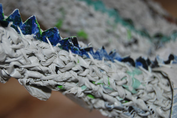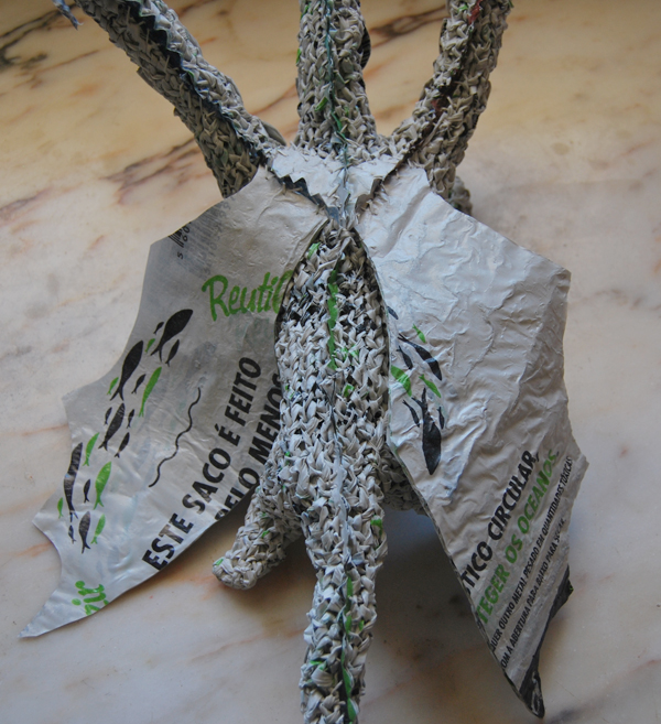 I sewed them together using the same plastic but I pulled it tight so it became like a thread. It’s sometimes rather hard to get it right and it does keep snapping, but when you get into the rhythm you can get long strips perfect for sewing, plus you can use the short bits as stuffing.