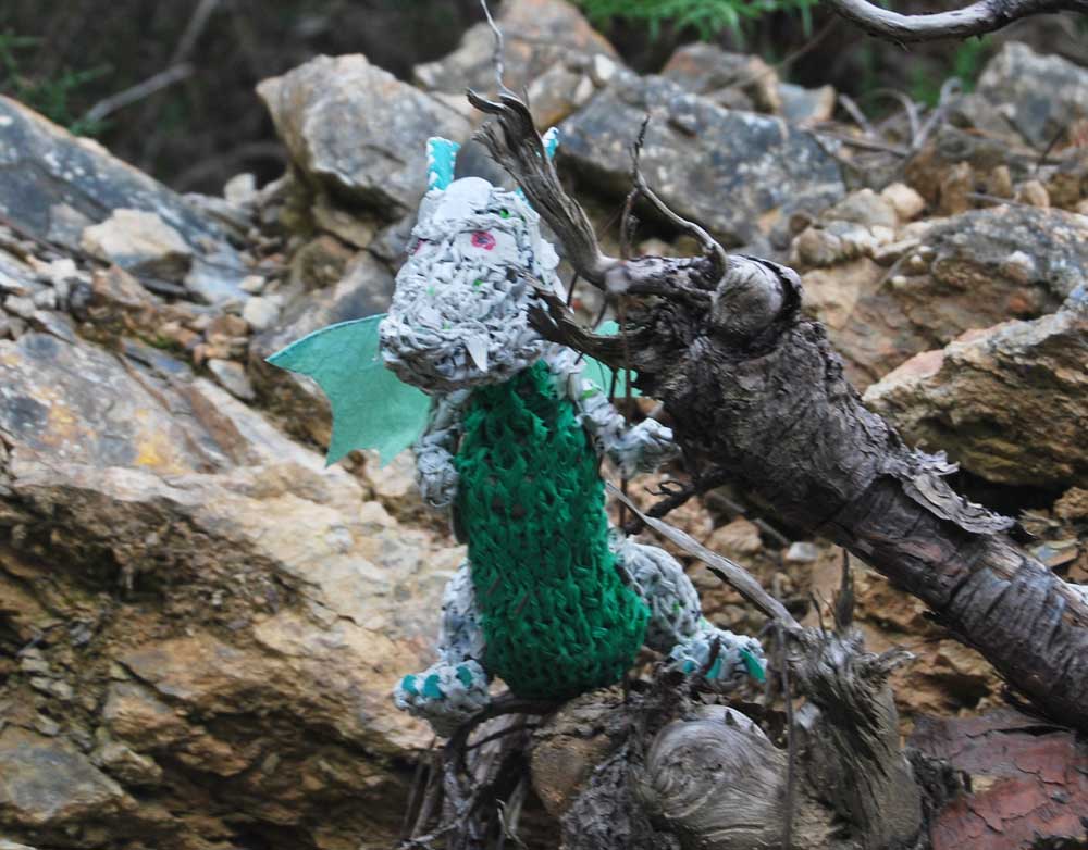 The big one came to life with all the added extras. With the goat-like horns, I thought I would have to use wire to get the curve right but I knitted it using mitred corners for the curves (I use mitred corners a lot with bits like the legs and sometimes the main body too) and it somehow it just worked perfectly. The scales alternate between green and white ironed plastic and were cut into slightly pointed plates and sewed down from their tops. The claws were made from green plastic sewed together with lengths of knitting around their base. I did what you could call “Plastic Surgery” on the face by knitting little bits like eyebrows and a long thin strip for lips and a curling length for the nostrils and sewing them into place.