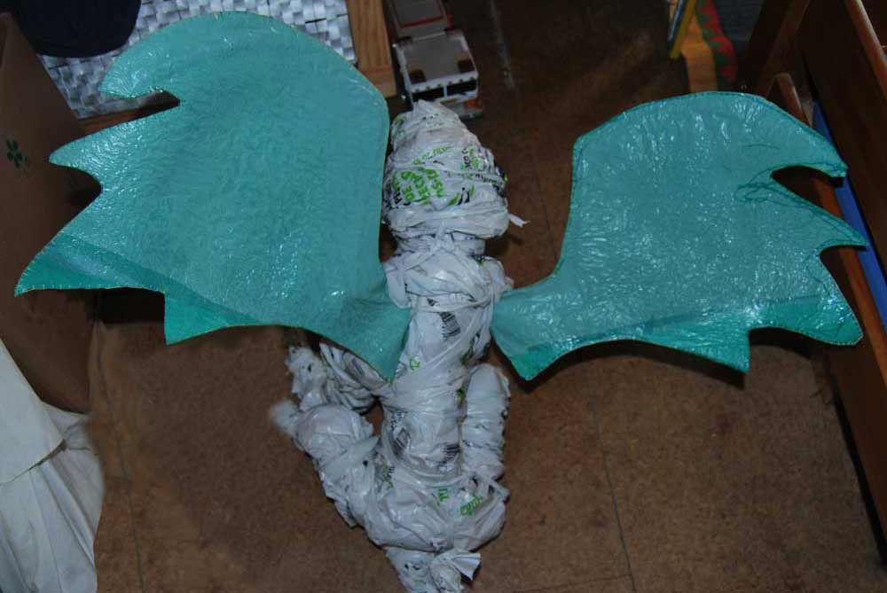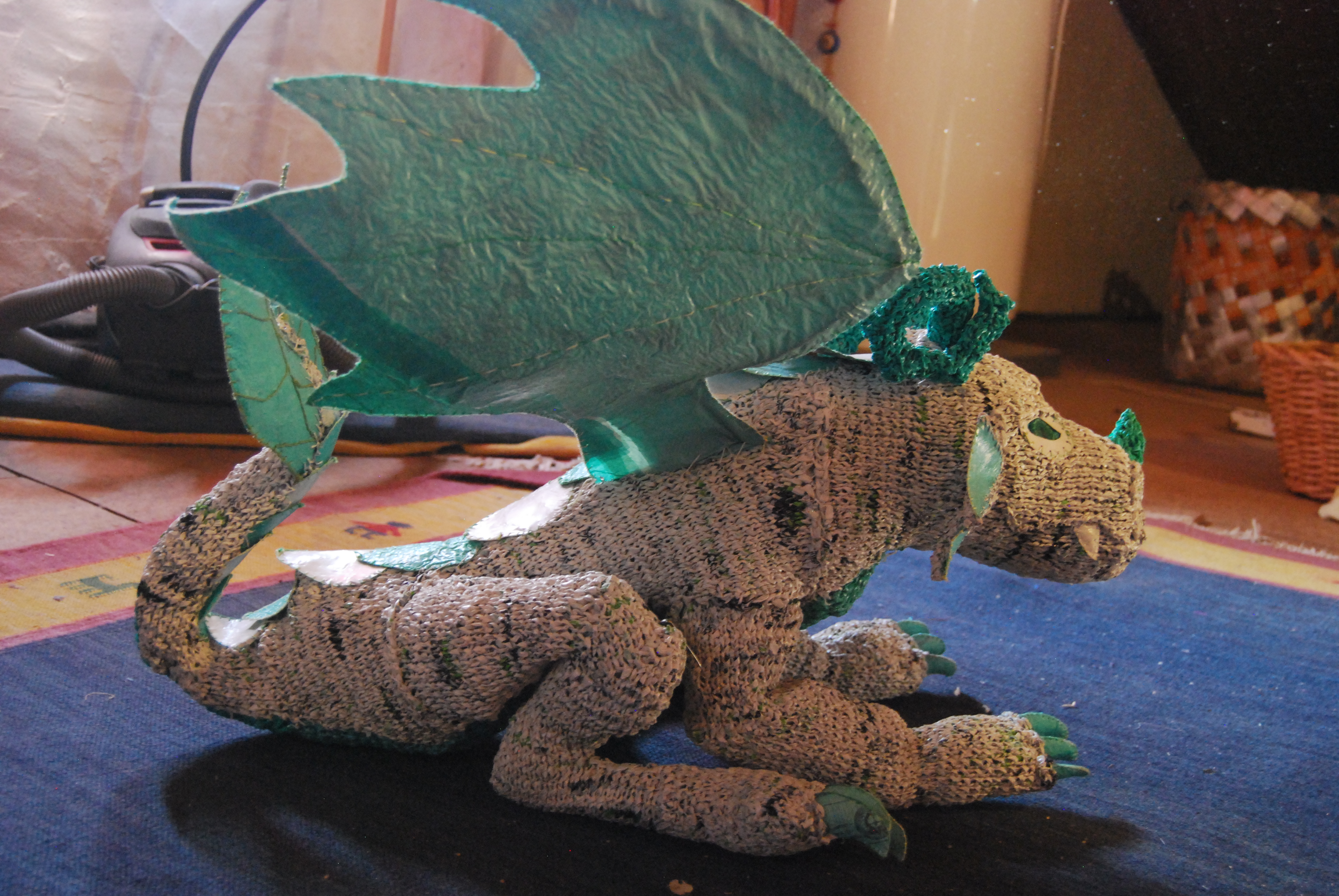 I had knitted quite a few dragons before this and I wanted to make a really big one but I knew I didn’t have enough material for the size I wanted. I thought about what I did have and I came to the realisation that I had stacks of plastic bags. One might say it was slightly ambitious to try to knit a dragon roughly 35cm high, 65cm long (with tail bent) and a 70cm wingspan out of strips of plastic bag when your only prior experience knitting with the material was a 10cm square to see if it was even possible. I have now made several such dragons and have learnt a lot from the experience.