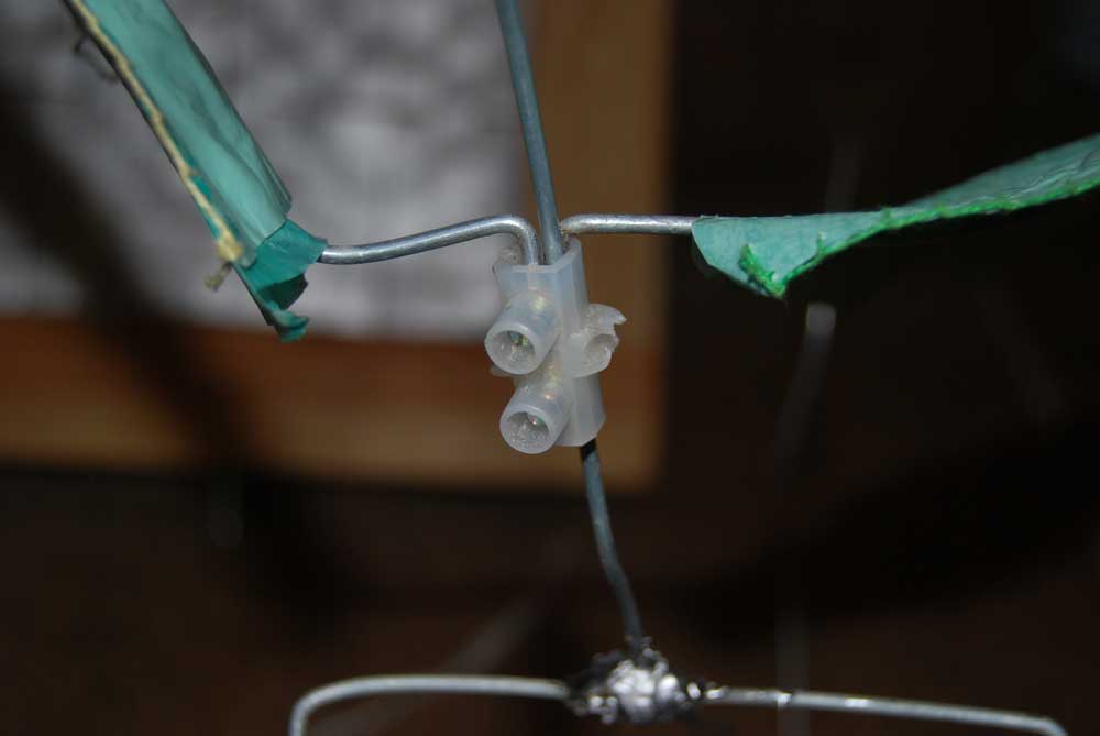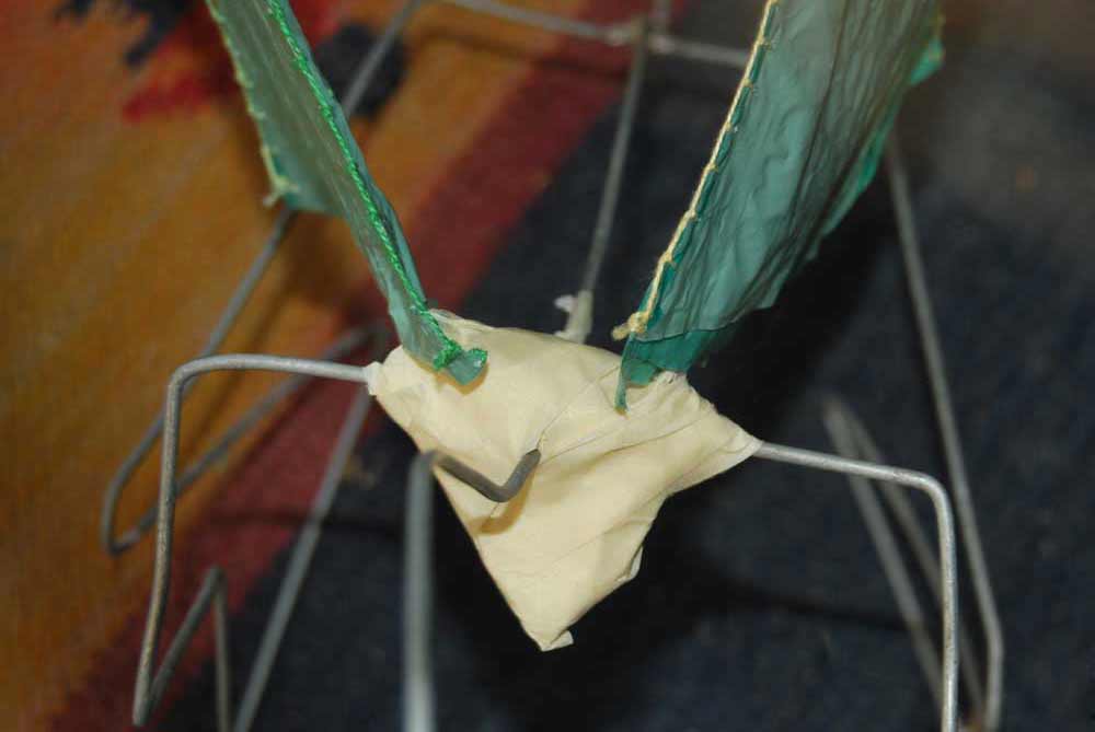 I tried several ways to attach the legs and wings with tape and thin wire. In the end, I soldered the legs but had trouble with the wings due to their weight. Finally, the idea came to use two wire connectors by slipping them over the main frame and tightening the screws until they stood firmly at the right angle.