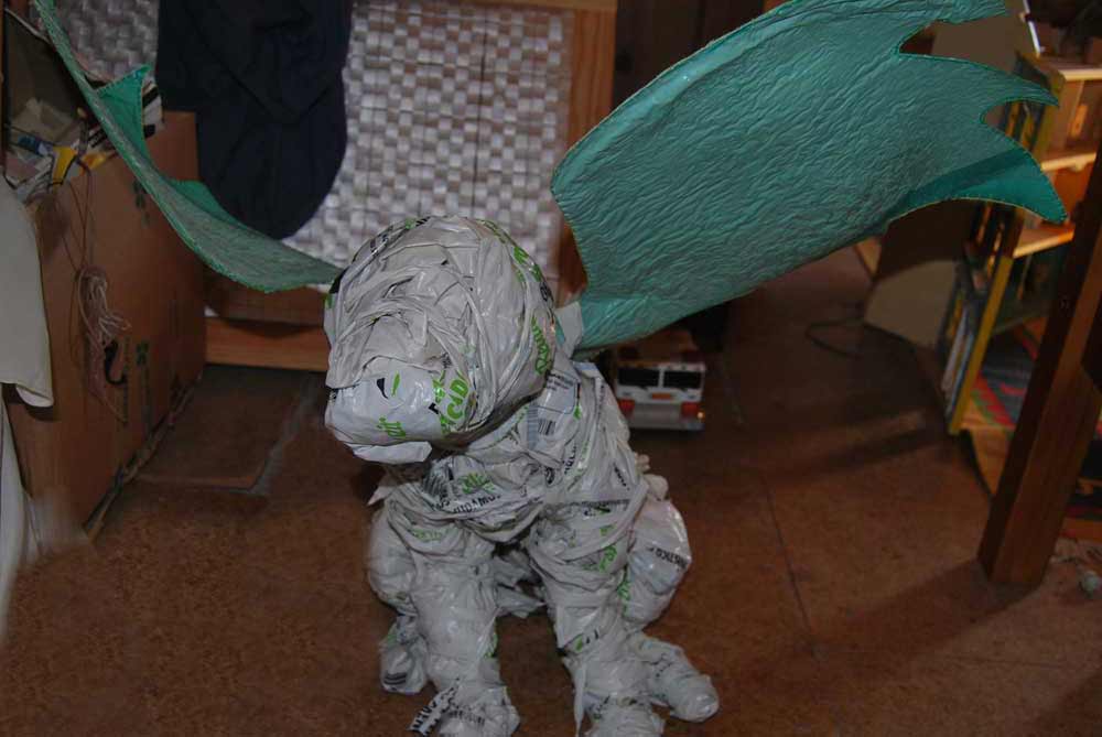 The wings are made from plastic bags I ironed together. For the big one and both the black and white ones I used wire but with the three-headed dragon and the small one I just sewed on.