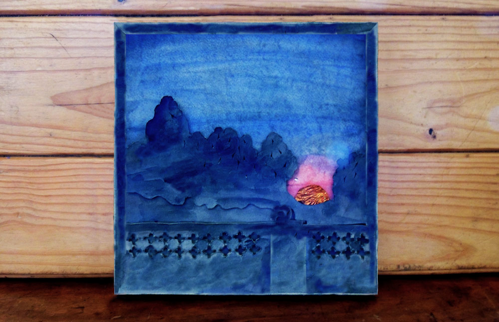 On the eve of this birthday we were treated to a spectacular moonrise with a bright star next to it, so I tried to capture it using silhouettes in pizza box using watercolour and foil wrappers.