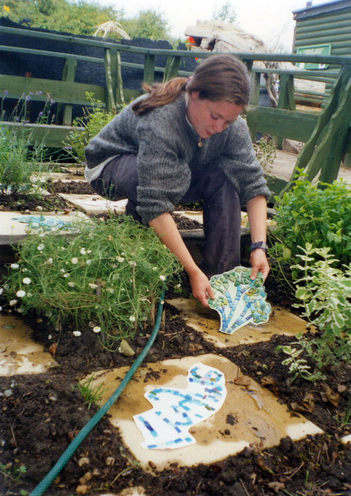 Placing some mosaic designs of herbs and their names onto paving stones in a herb garden.