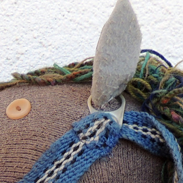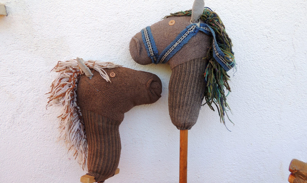 Recently the stick snapped on the grey one so we replaced it with some old broom pole. I also added some woven braid as reins, hooking them over the ears using ring pulls.