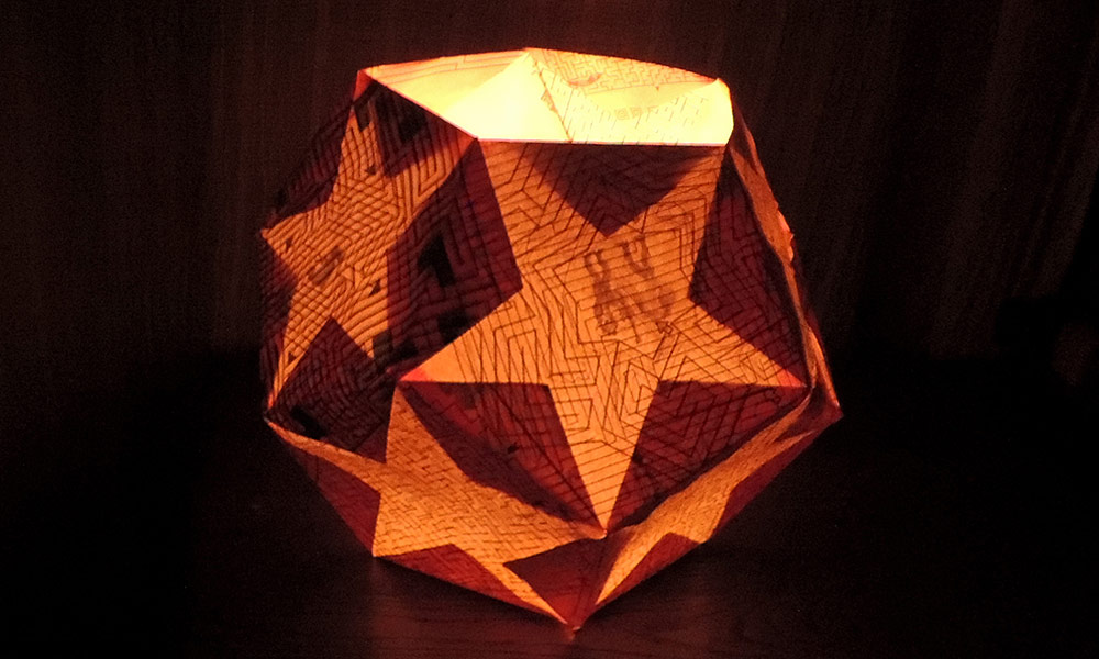 I had a lot of pentagons left over from my attempts at making a woven dodecahedron lantern, and then I remembered these star lanterns that I have long intended to try.