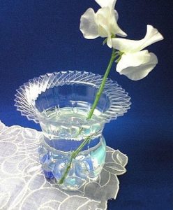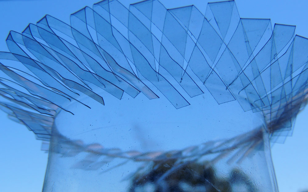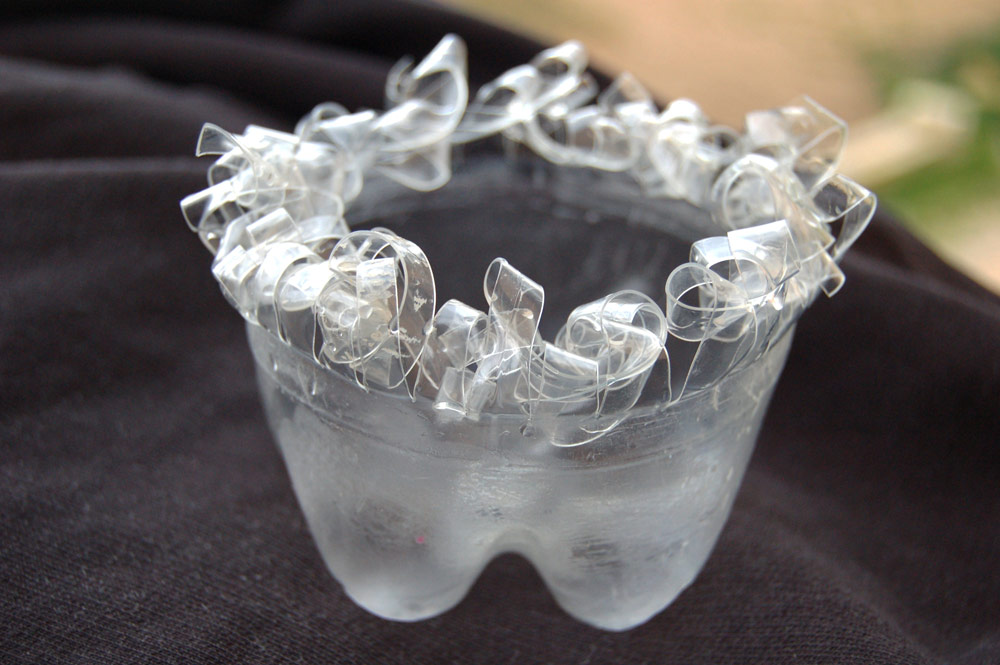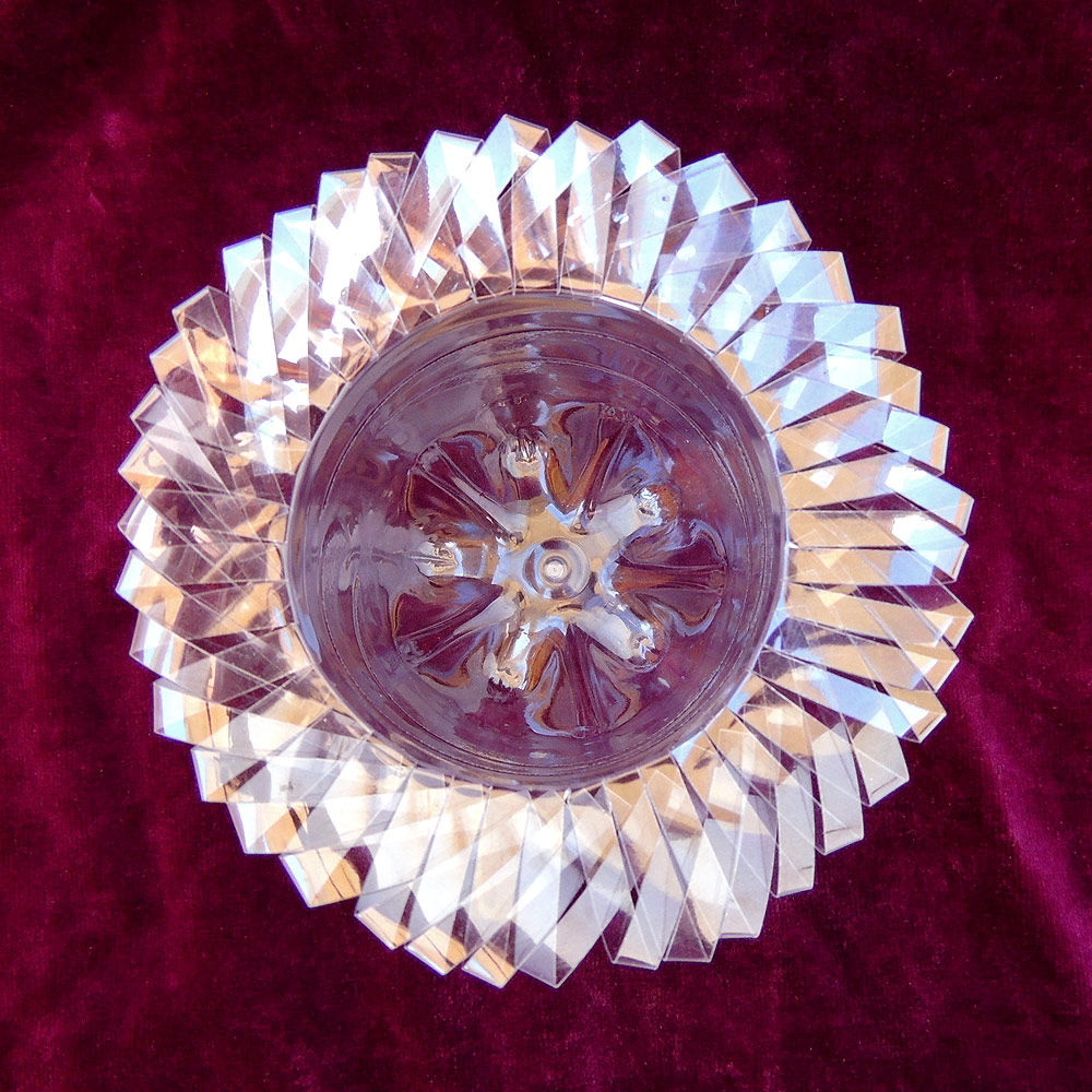 I have been looking on the internet to see what other creative things people have been doing with plastic bottles and I thought I’d have a go at instructions by Wonderfuldiy who shows how to make a crystal effect by weaving strips of the top of the bottle to form a rim.