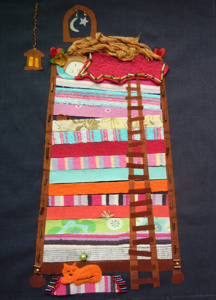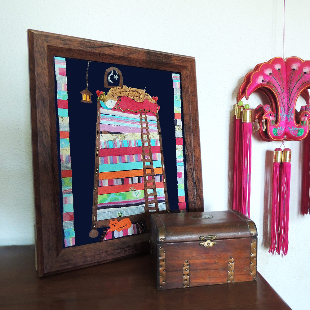 I revisited the idea and decided to buy some fusible webbing to try a small iron-on collage – on a more manageable scale. It still used small parts of the all the baby clothes, some bedsheet for the background, some brown satin from the lining of a suitcase. I added lots of beads which was fun because I don’t get chance to do decorative projects often.
