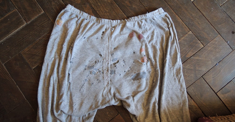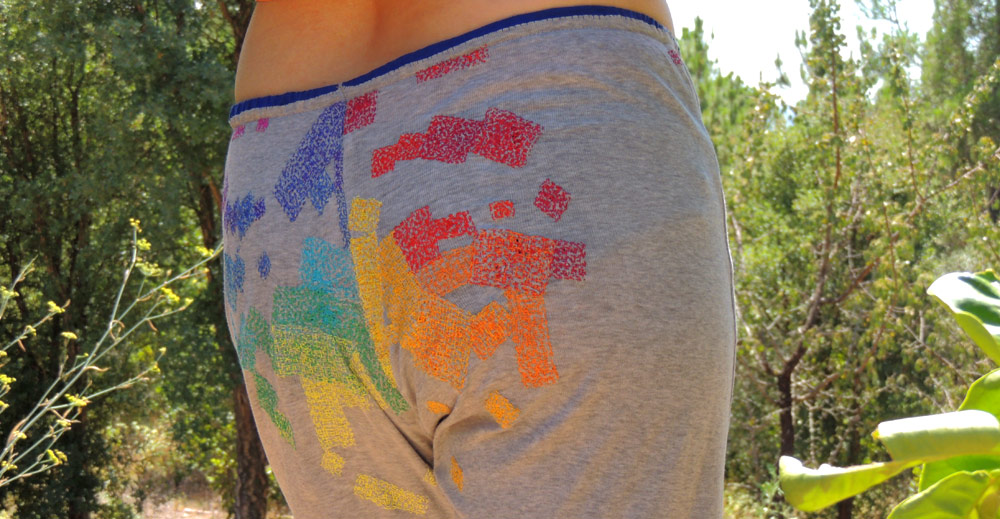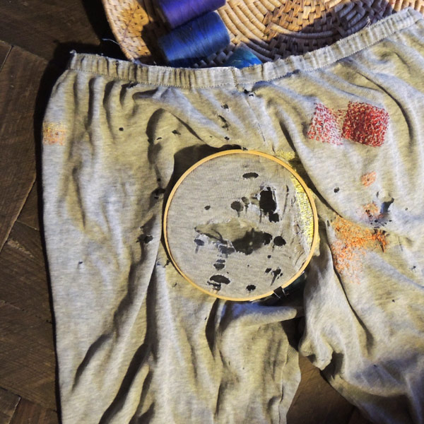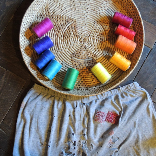 This was more of a restoration project than a repair. My pyjama shorts were very old and I’d done some repairs years ago – mostly in boring grey. Fortunately only the backside has holes – else I would have consigned them to the rag bag. I unpicked the worst repair – a large patch made of heavier jersey and was left with LOTS of holes. I stitched each by needle weaving with normal sewing cotton. I enjoyed blending the colours – that’s what kept me going!