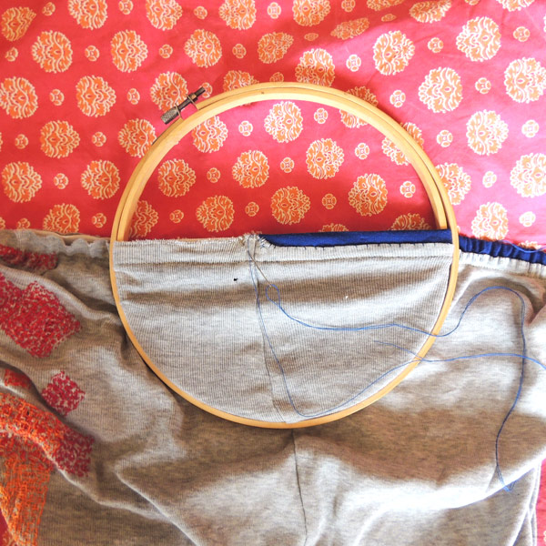 The waist band was mostly fine but the top had frayed open against the elastic. I used the same method as I did with these pyjama bottoms using the hem of a t-shirt which was useful because the existing crease helped create a neat finish more easily.