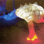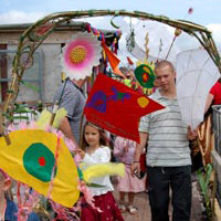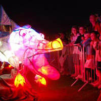 Young people helped to paper giant willow lanterns of a head and tail of a ‘dream dragon’. Lit with coloured LED’s, this kinetic lantern sculptures were linked together with billowing pillow banners. These were dyed and printed by the young people with symbols of their dreams of the future for our environment.