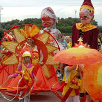 Inspired by black and white images of old Morecambe and ‘magic lanterns’, an early type of image projector that used paintings, prints, or photographs—on glass plates  and a light source. We ran a series of costume, props and choreography workshops on a tour of community centres in Lancaster and Morecambe. This culminated in a show and carnival procession featuring pirates and mermaids, strongmen, inflatable bathing belles, giant Punch and Judy, crazy clowns, and a sunset queen with her dancing sun rays.