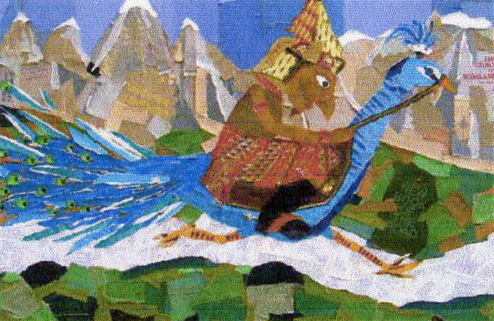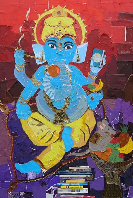 Colourfully illustrated scenes including Ganesha in his library eating fruit and reading books with Mouse, Biddhi and Siddhi listening to stories, Kartikeya speeding past mountains on his peacock and many amazing scenes from around the world featured in the stories. Some of the boards were large – 3 metres wide. The collages were digitally reproduced and used in a ‘wrap’ to decorate the entire exterior of the bus.