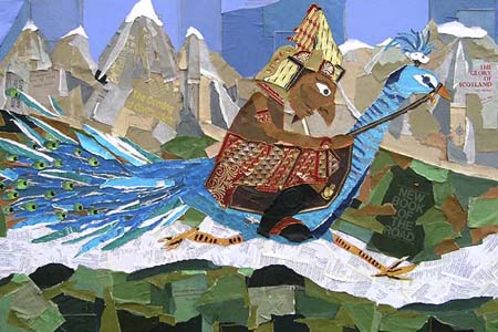 Around the world races Kartikeya. He storms through jungles, marches past pyramids and whizzes past the northern lights without even noticing. Tired and exhausted he starts to slow down as he approaches the UK and spends the night in the town of Blackburn. Wearily he gets up in the morning and struggles on past Darwen Tower. Meanwhile, back in his comfortable library Ganesha helps himself to a breakfast of bananas, coconut and melons and reads another book.