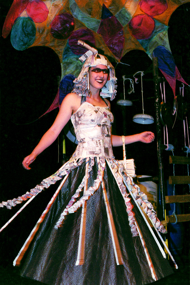 Recycling on the Runway (2002) was a fashion show using recycled and reused materials; a partnership project between Rethink Waste in Lancashire (Wildlife Trust Waste Awareness Project 1999-2003) and Morecambe Youth Café (a drop in centre for young people). I came in to help with the last week of preparations after the groups had spent 3 months getting things ready.