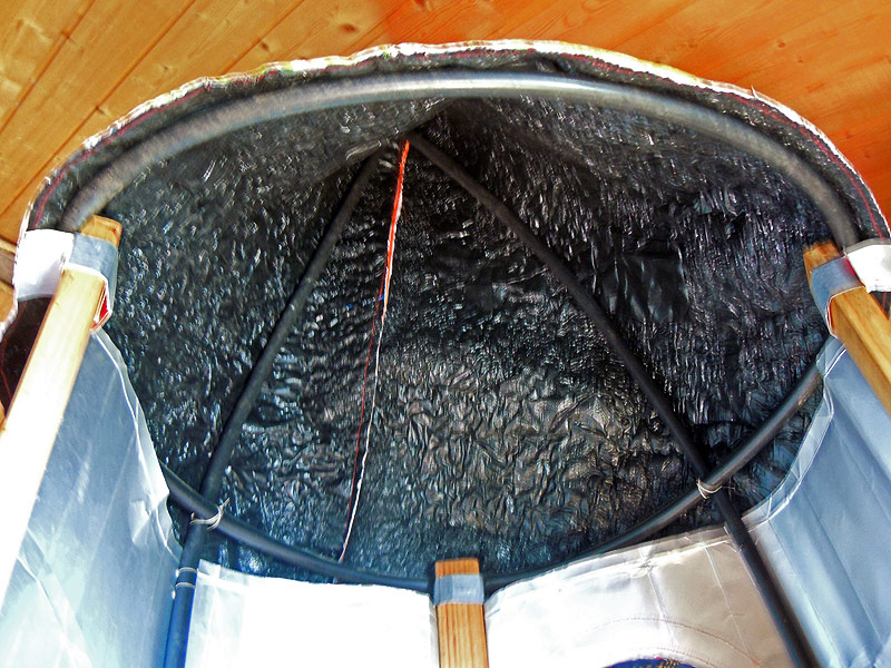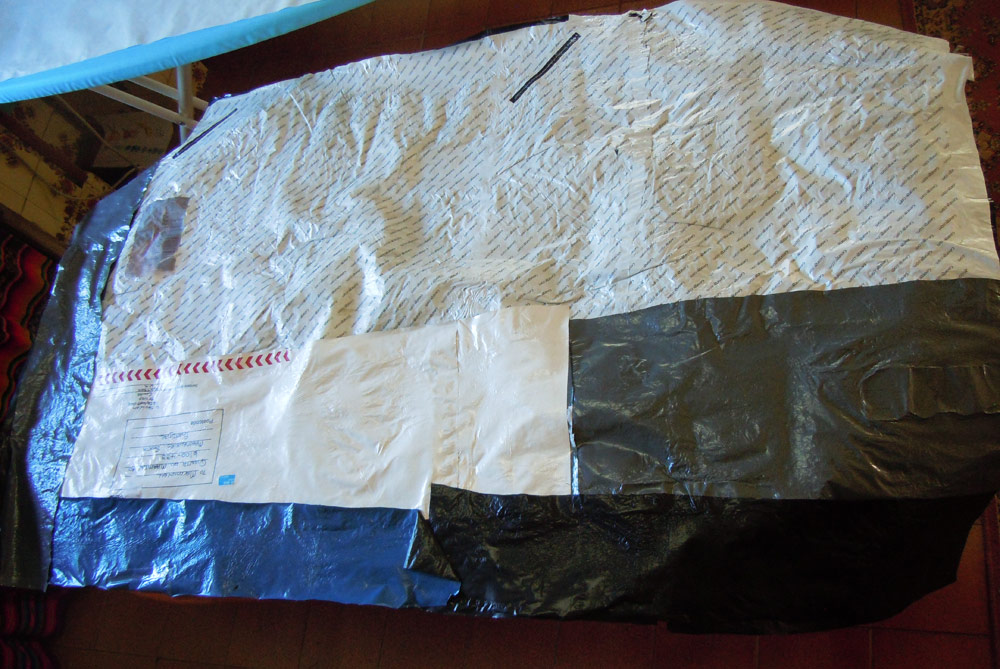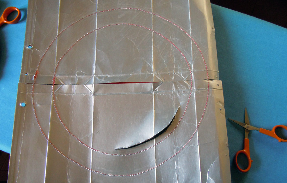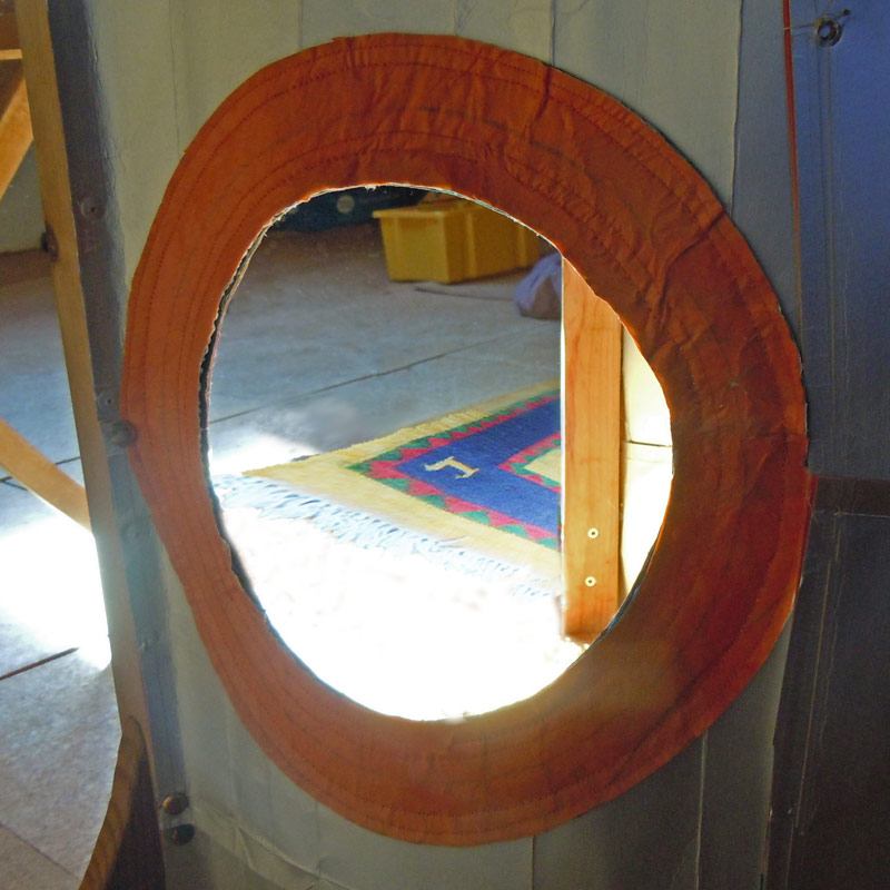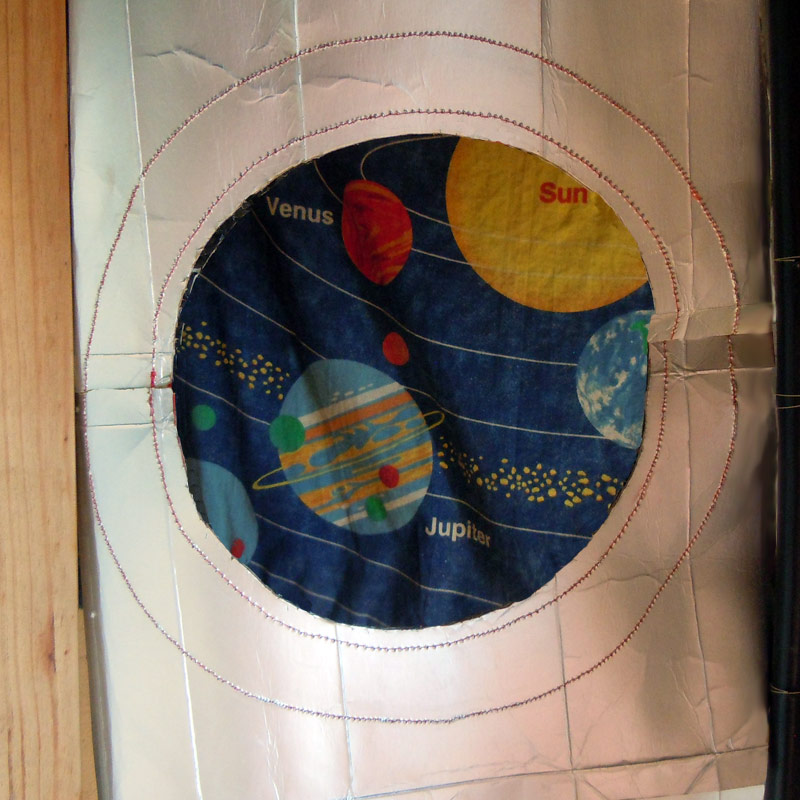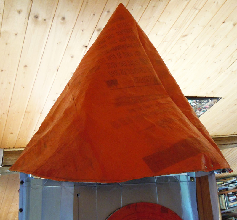 I cut a semi circle out of the large sheet and sewed it into a cone using my sewing machine. There were just enough scraps left over to piece together the portholes. I sewed these to the tetra pak panels.
