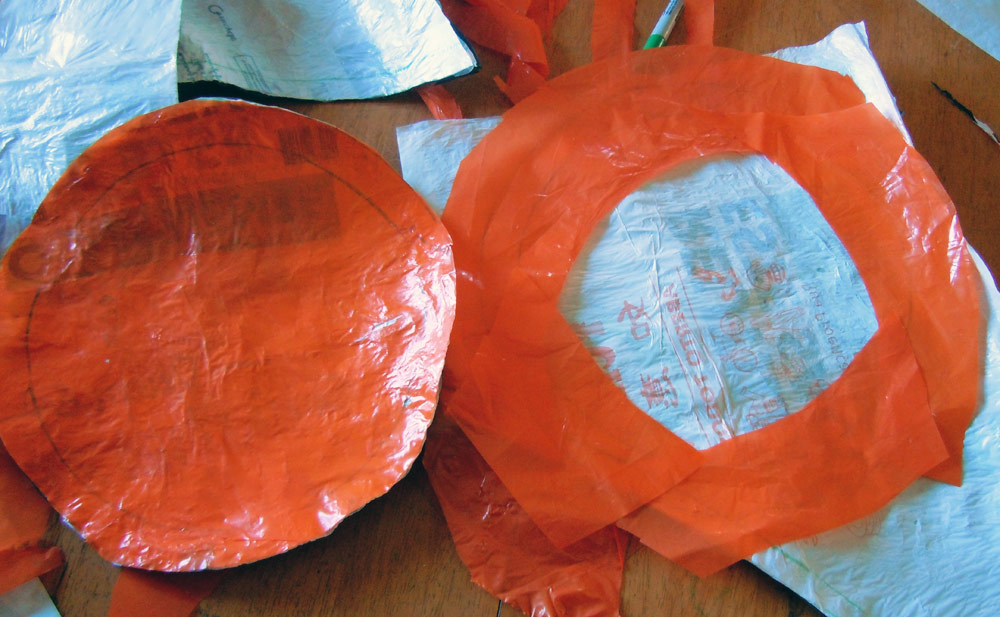 I fused 6 layers – clear, orange, mixed light, mixed dark, mixed light, dark on the inside. The inside layers are made up of a patchwork of all sorts of used waste plastics that were ripped or had holes. I managed to use up a pile of mailing envelopes that I didn’t know what else to do with. I found that doing light and then dark layers helped me see where I was going.
