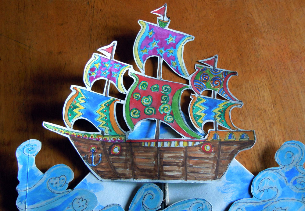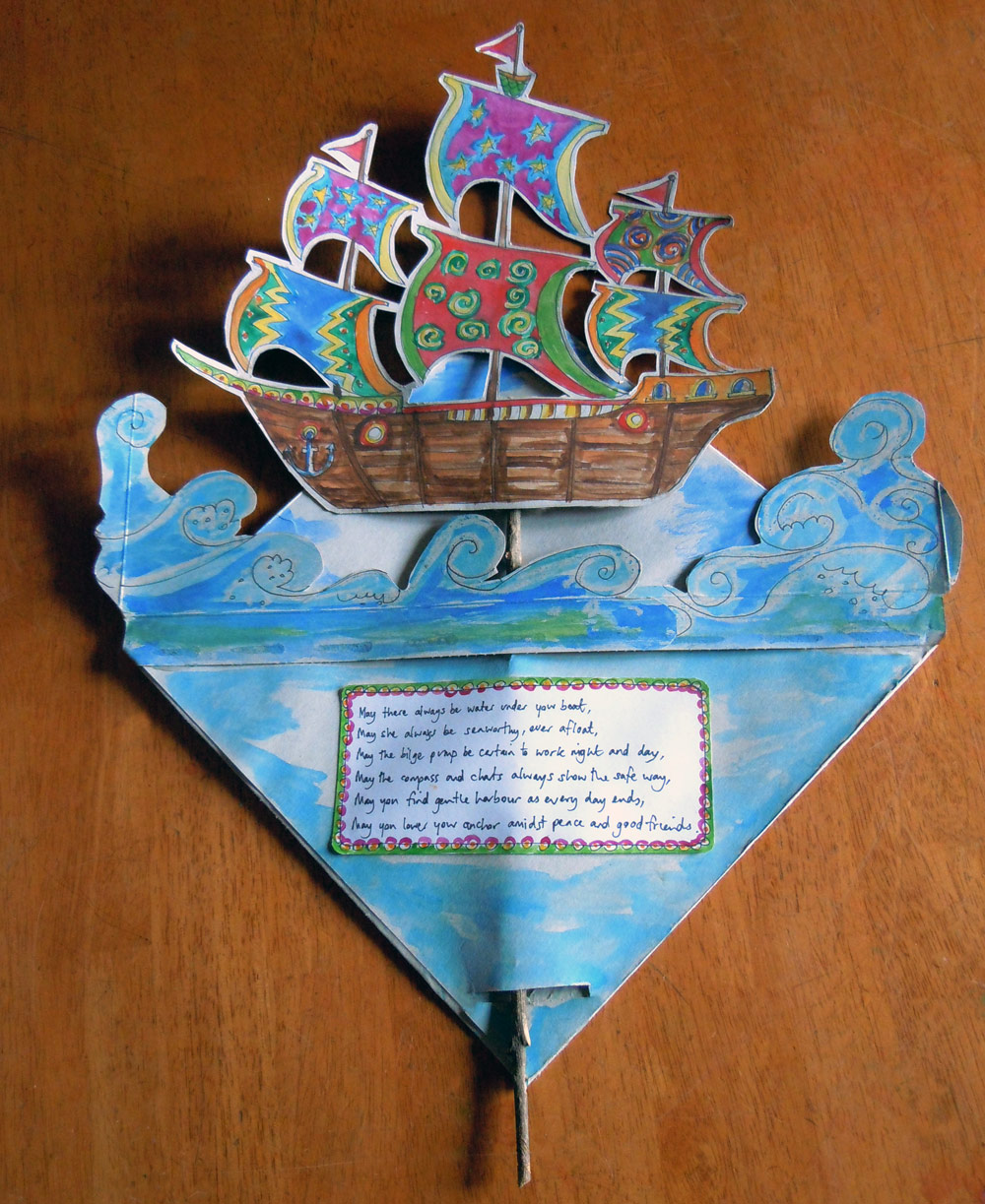 A sailing-ship-on-a-stick card so that it can pitch to and fro on the waves.