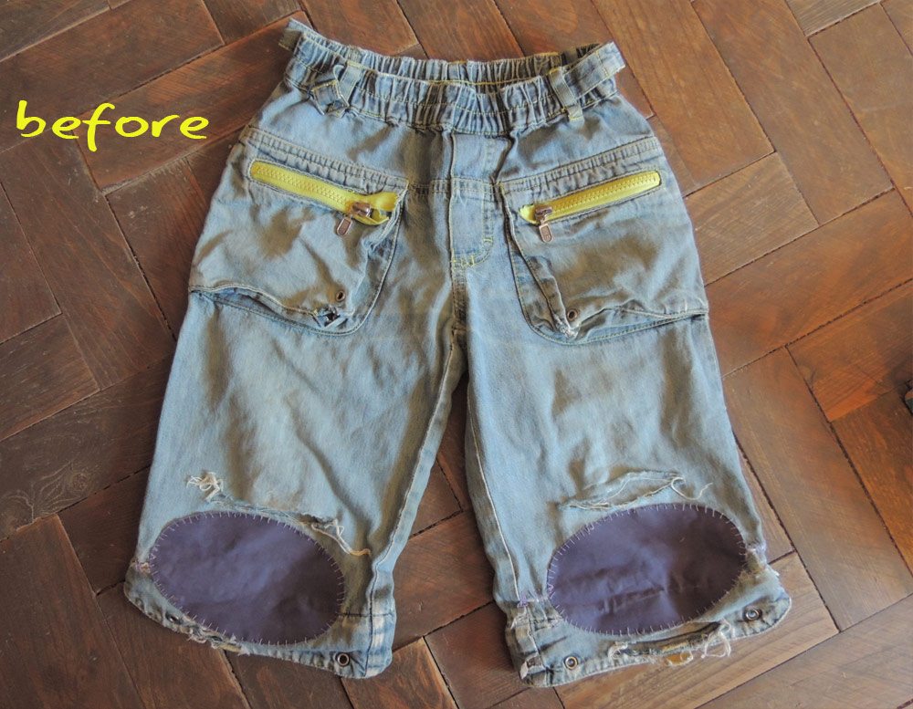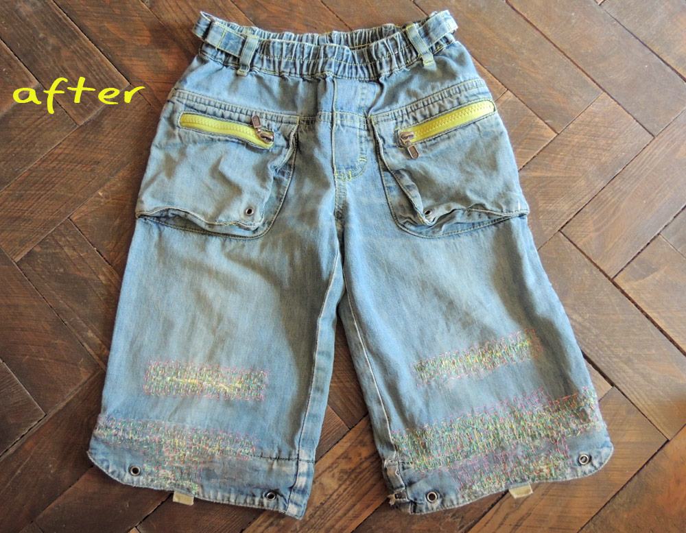 This is a pair of zip-off jeans that we got second hand and have been heavily worn by about at least 2 of our kids. I had a phase a few years ago of ironing on bought patches and since then have found better and longer lasting ways of mending tears and holes. You can see that these patches weren’t right for the job in the first place – the holes had split to the seams therefore the patches were too small. They were a bit bunched up in places where they were clumsily stitched. The jeans have since formed holes above the old patches.