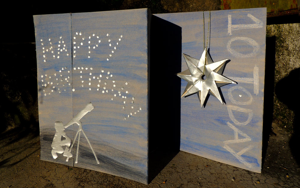 A card about star gazing made from cereal boxes, with wax, paint, tetra pak and my favourite origami star designed by Javier Caboblanco.