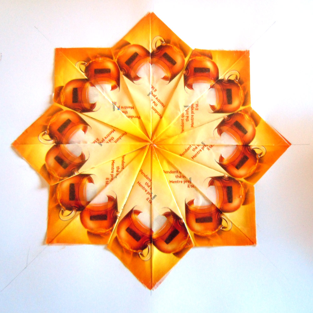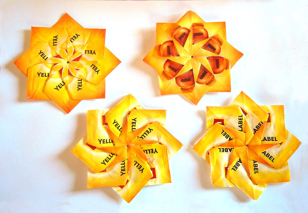 I’d not tried this before, but I’d collected a large pile of these wrappers in such lovely bright colours and was keen to see what was possible. I started with the most basic folds (above) and look at the variety of patterns possible with just one wrapper.