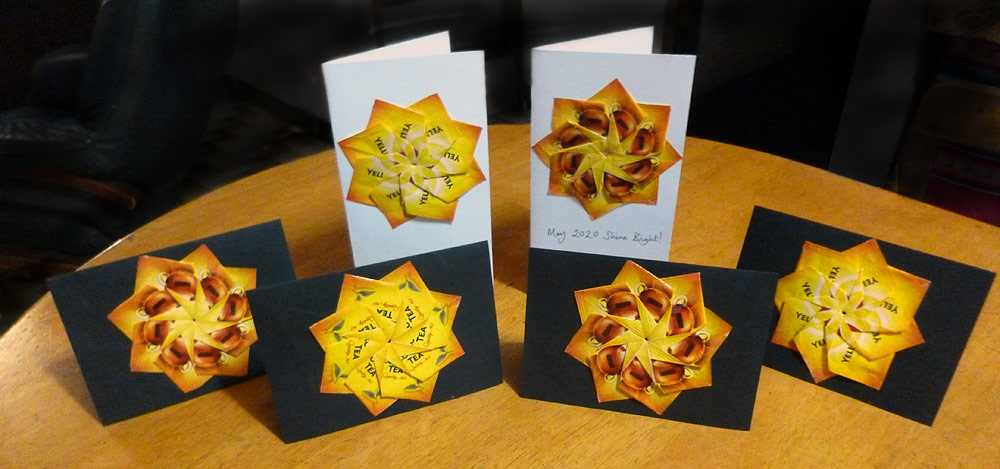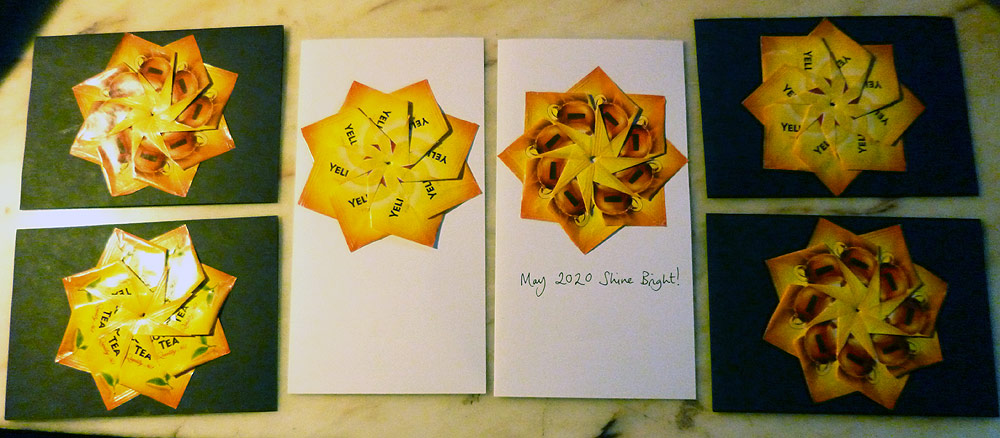 These are the wrappers from individually wrapped teabags folded to make stars. I worked out the designs that gave the best results here and made a few of each.