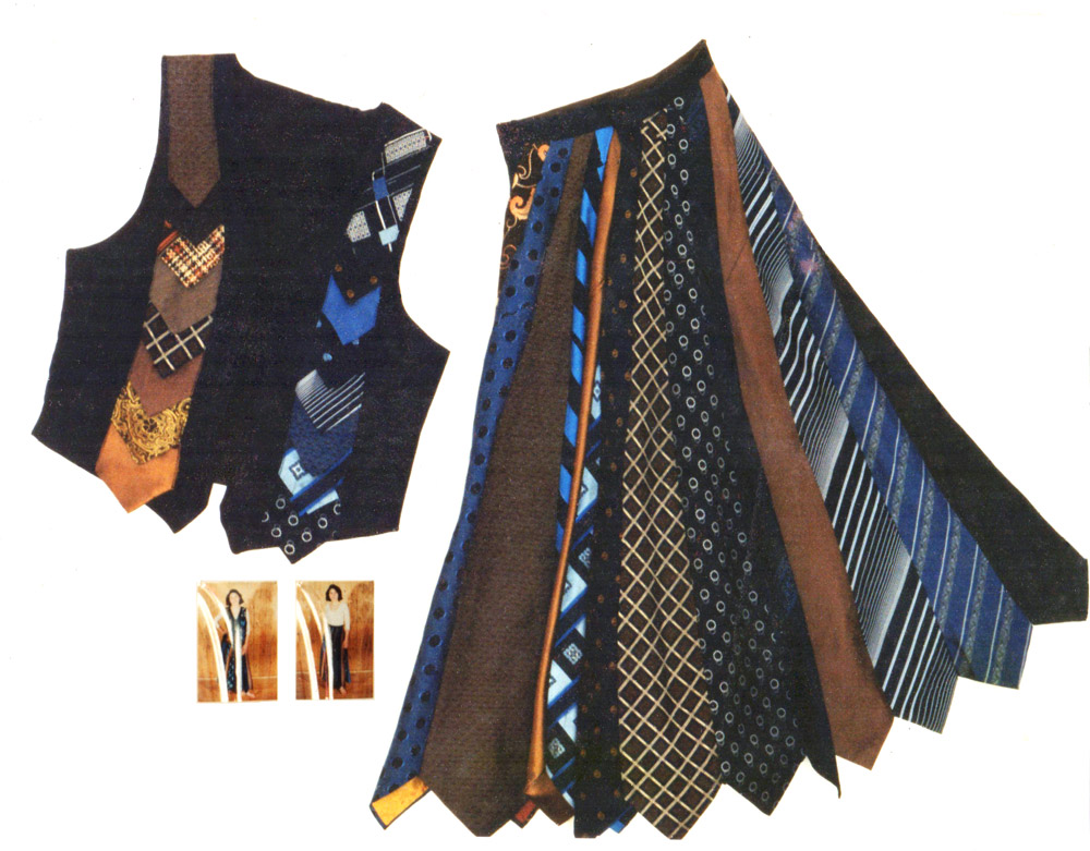 Recycled tie skirt in browns and blues, with matching waistcoat utilising the left over ends of the ties.